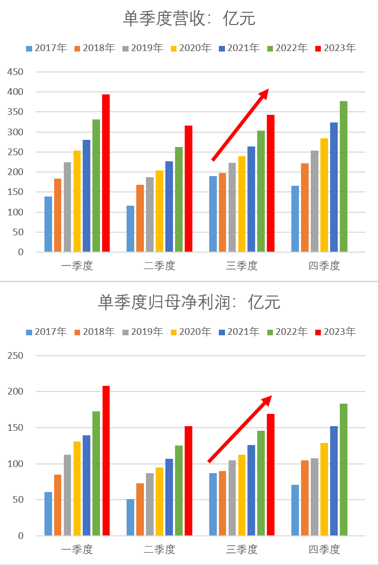 茅台第三季度营收343亿,环比增9%同比增13%;第三季度归母净利润169亿,环比增11%同比增16%。
