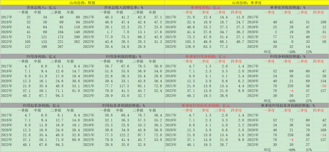 我们再来看下$山西汾酒$,今年前三季度的营收增速是21%,归母净利润以及扣非归母净利润的增速都是33%。