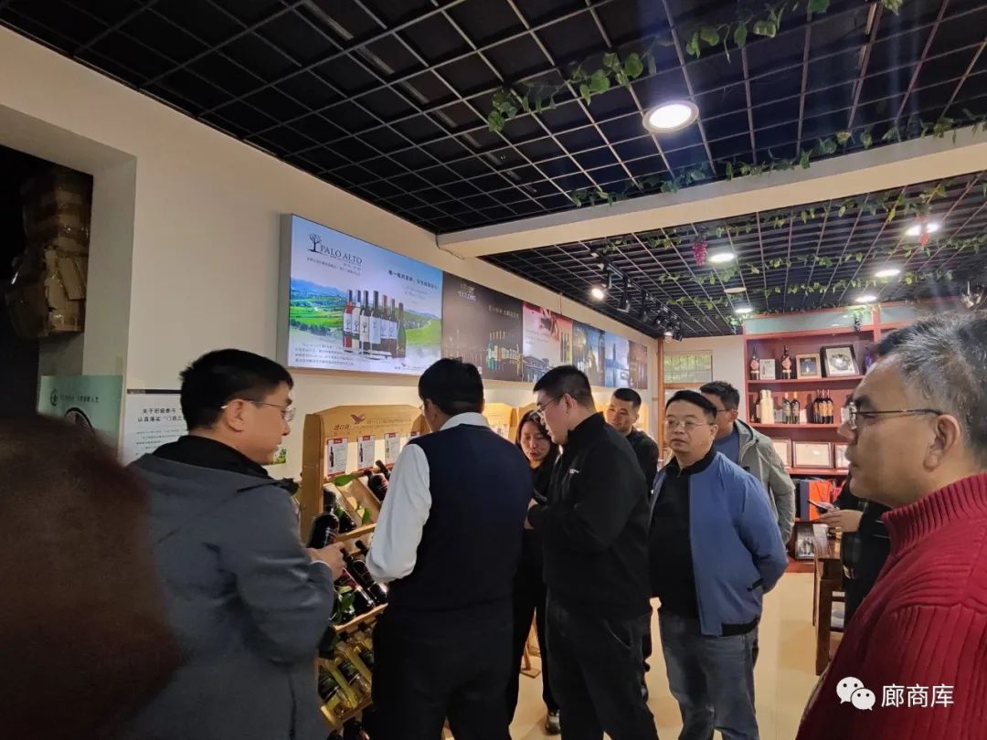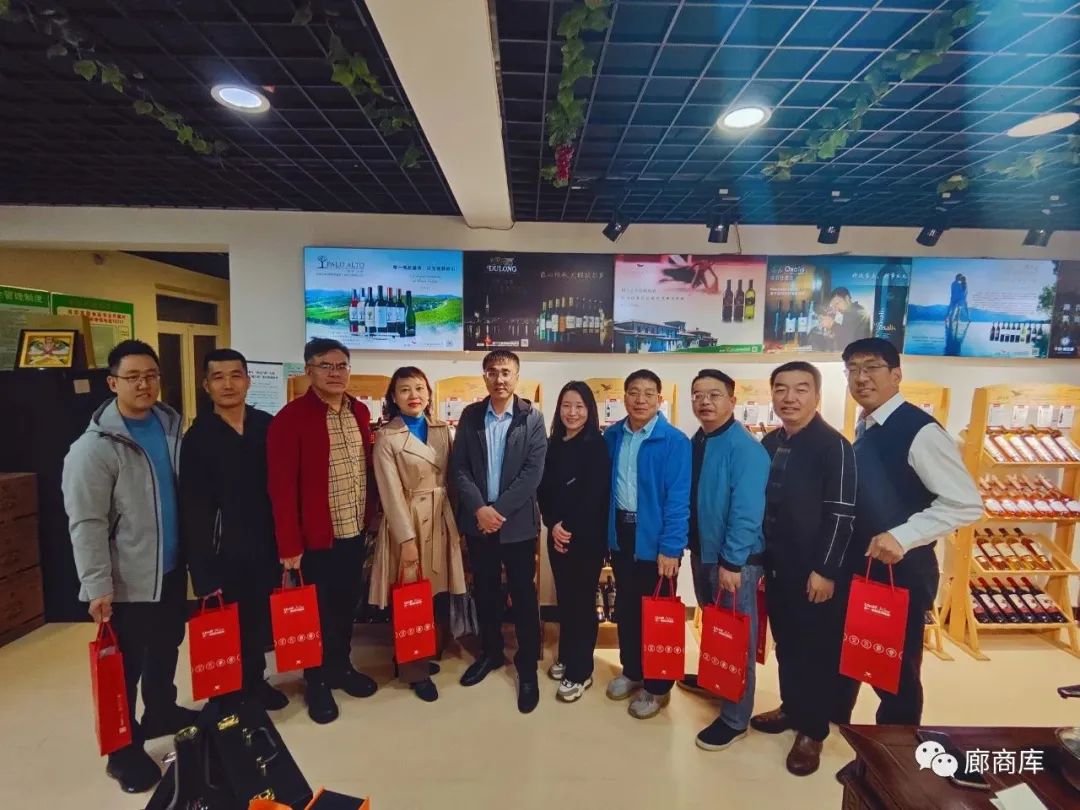 11月8日下午,以渤海银行广阳道支行行长孟祥鹏为团长的廊商库走访团,联合宏峰机械姜永、毛铺酒黄成、天泽影视传媒张志忠、市经典普洱藏馆张小燕、梁杰律师、律诚商标代理郝明旺、博世车联星程刘俊洋、米创文化张志刚等行业老总,共同走访了位于广阳区六大街北外街建华里小区9栋1203号,统一原瓶进口葡萄酒总店交流合作。到场嘉宾们参观了统一进口葡萄酒的的整体环境和配套设施,一楼设置有红酒展区、会客厅及储藏室,二楼设有茶室、办公室。