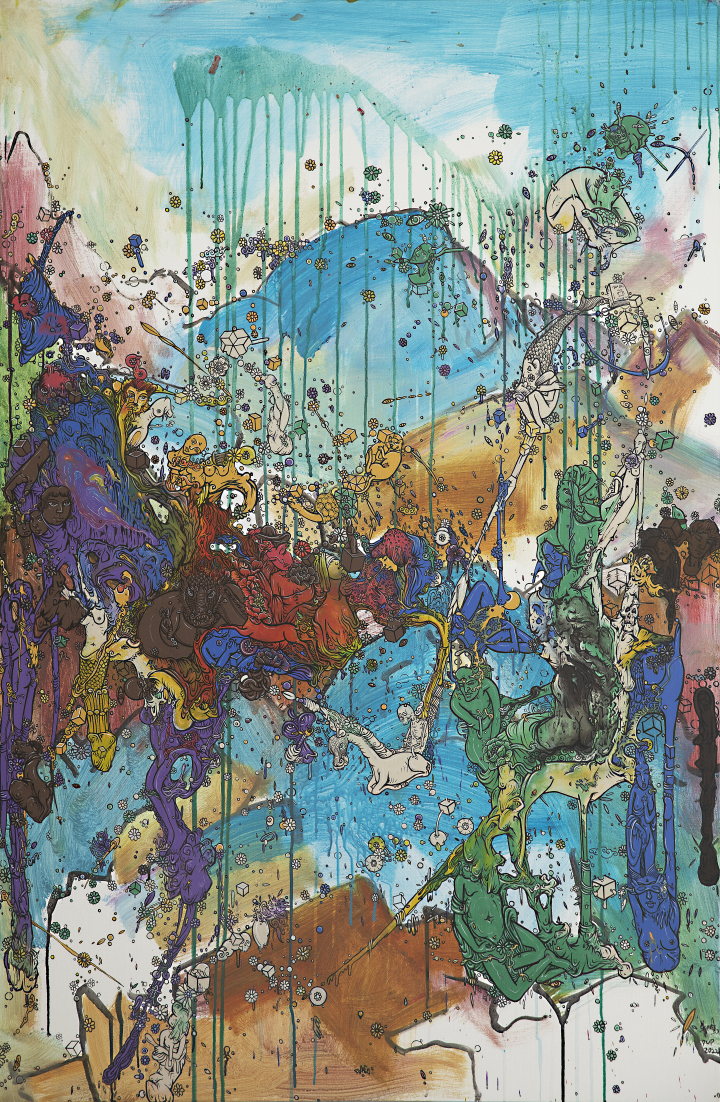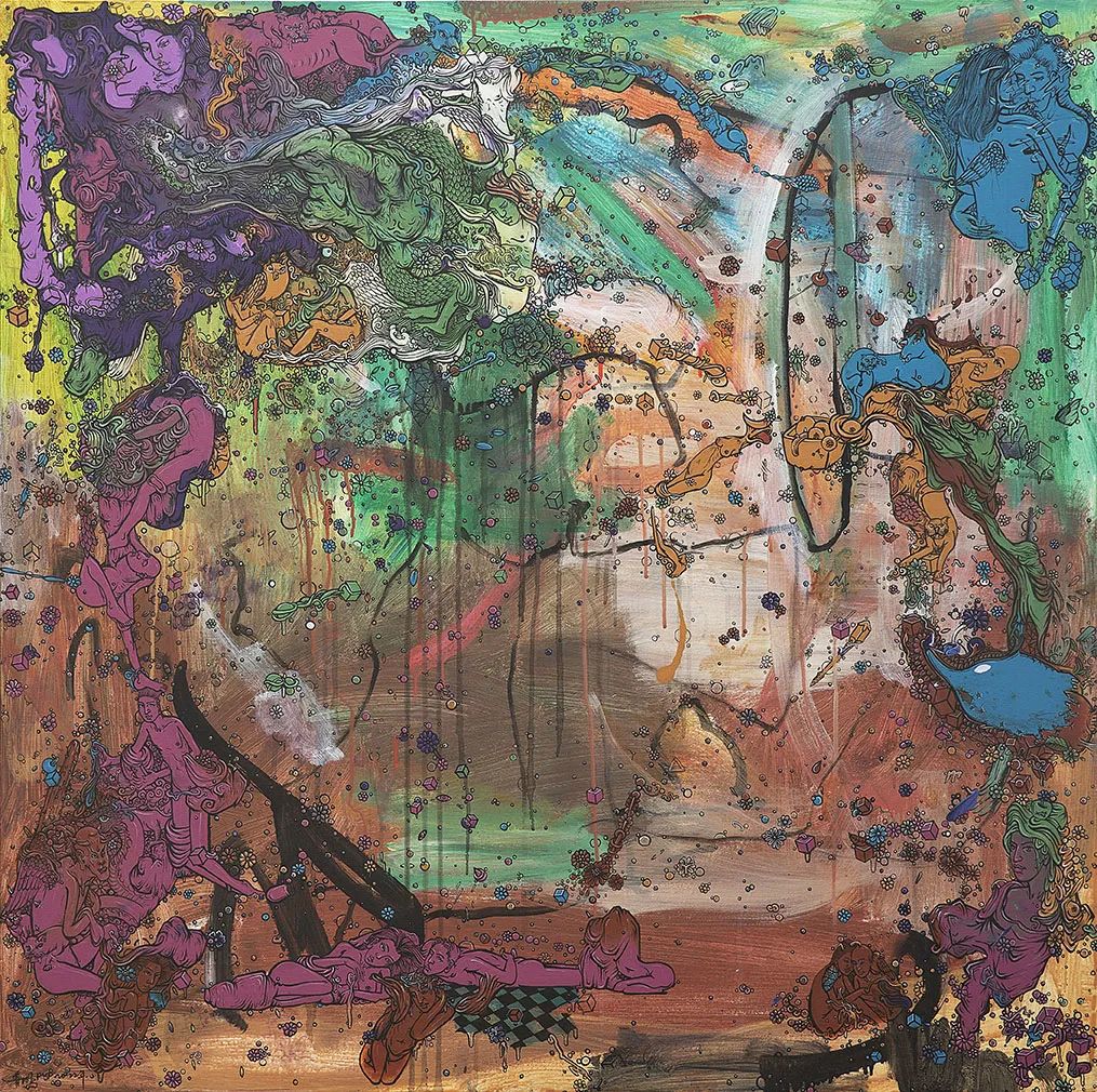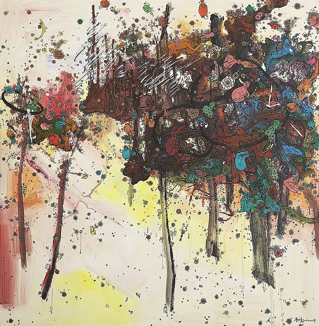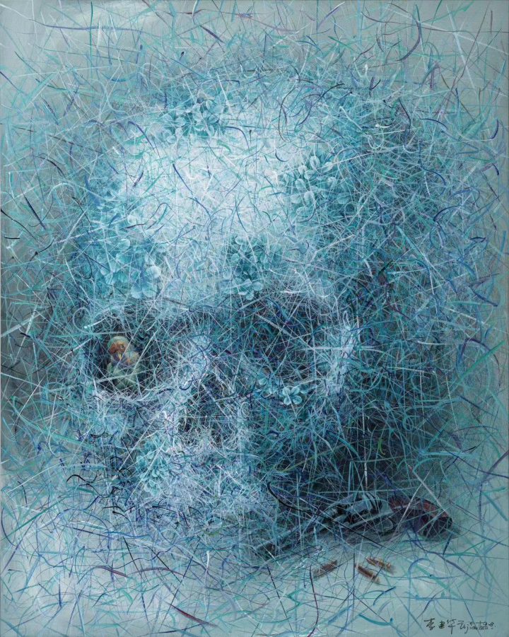 普鹏在创作上尝试了多个主题的探索与表达,有人物肖像的描绘;有宗教哲学与人性的思考;有人文自然和环境的探讨;也有怪诞与玄幻的观念性体现。无论每件作品主题呈现的是什么,似乎都有一条隐形的线索贯穿其中,那便是普鹏独特的作品风格和形式语言的构成,是他个人经验对生命的思考和诠释,也是他人生观、世界观的视觉呈现。因此,观者在普鹏的作品面前,常常会给人一种魔性的感知,即是当你的视角关注在他画面某些细节之间的时候就会不自然的去联想,从而进入一种幻觉的迷离状态。