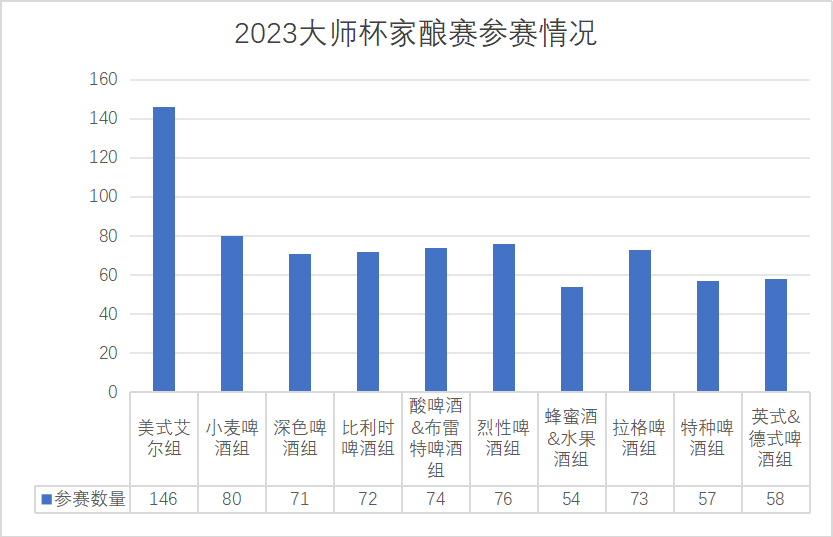 2023大师杯共收到761款家酿作品,除美式艾尔组别的数量相对其他分组较多,其余九个分组的参赛作品数量都在一个相近的数量之间;相比于往年的家酿参赛情况来看,以往冷门组别(冷门风格)参赛数量与热门组别差距较大,今年的转变我认为有以下几点推论:1.参赛选手更加了解大师杯的赛制,相较于热门分组,冷门分组由于参赛作品较少,竞争相对来说也更小,转战冷门风格有希望能够获得更好的名次。2.随着精酿啤酒的普及,家酿参赛选手能够更加容易获得酿造知识与技术(对酿造风格的把控,对于酿造原料的选择,对于冷门风格的了解,对于酿造工艺的执行),因此,以往非常少见的冷门风格,对于目前的家酿爱好者能够更加容易的接触到,酿造冷门风格的可能性也大大增加。3.目前市场上,酿造原材料的普及,能够让更多的家酿爱好者买到自己心仪的酿酒原材料。本届职业酿造组参赛特征
