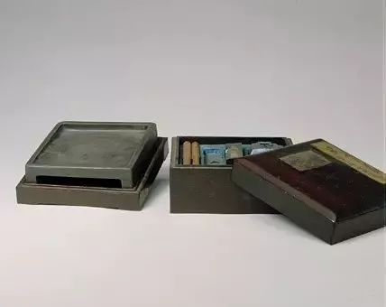 此砚与墨两锭、笔两支、铜水丞、铜勺共装于一紫檀木匣内,组合成套。砚石为旧坑端石,细腻莹润,且具确切年款,极为少见。