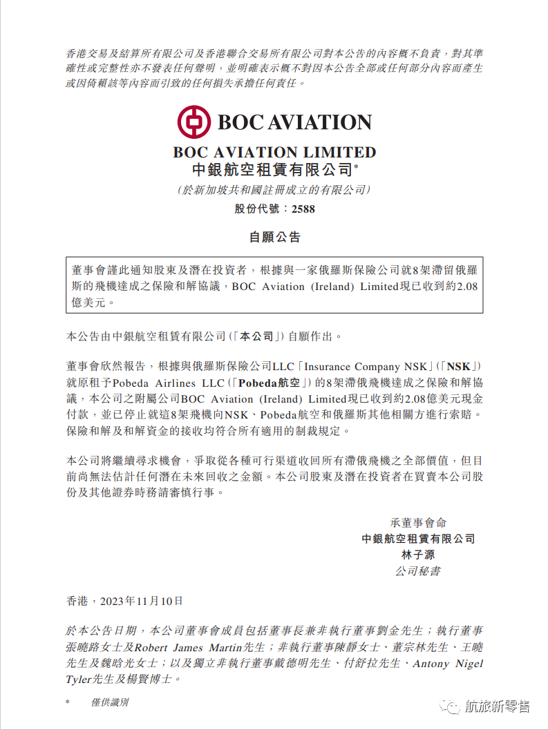 11月10日,中银航空租赁在港交所公告,根据与俄罗斯保险公司NSK就原租予Pobeda航空的8架滞留俄罗斯的飞机达成的保险和解协议,附属公司BOC Aviation(Ireland)Limited现已收到约2.08亿美元现金付款,并已停止就这8架飞机向NSK、Pobeda航空和俄罗斯其他相关方进行索赔。保险和解及和解资金的接收均符合所有适用的制裁规定。公司将继续寻求机会,争取从各种可行渠道收回所有滞俄飞机的全部价值,但目前尚无法估计任何潜在未来回收之金额。