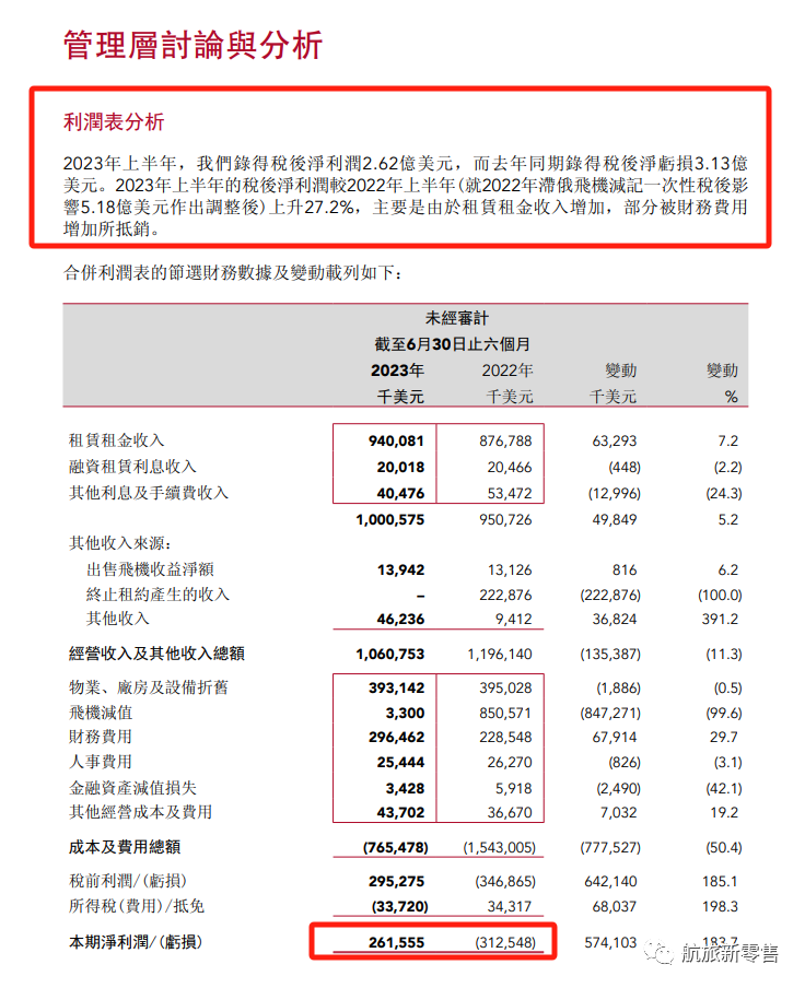 中银航空租赁2023年中期报告显示,2023年上半年公司净利润为2.62亿美元,而2022年同期亏损为3.13亿美元,由于滞俄飞机减记一次性税后影响5.18亿美元做出调整。