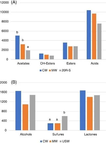 图1 对照和处理葡萄酒发酵过程中主要挥发性化合物的平均浓度(μg L−1)。(A):乙酸酯、酯和酸。(B):醇、硫化物和内酯。CW,对照葡萄酒;MW,短皮浸渍葡萄酒;USW,超声波浸渍葡萄酒。根据Student Newman-Keuls检验,p≤0.05,不同字母表示不同样品之间存在的明显差异。