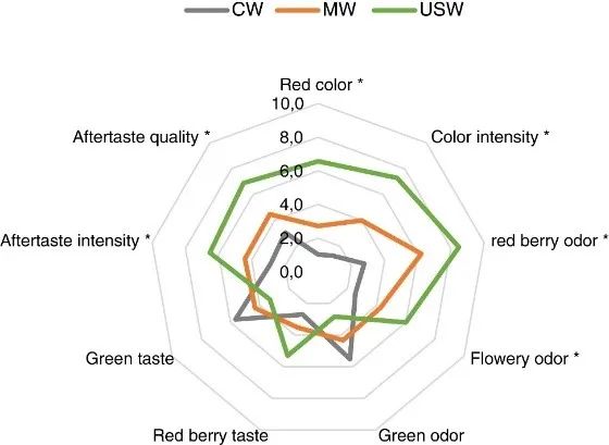 图2 对照组和处理组葡萄酒的描述性感官分析。CW,对照组葡萄酒;MW,短皮浸渍处理的葡萄酒;USW,超声波浸渍处理的葡萄酒。根据方差分析,p≤0.05,(*)表示有显著差异。