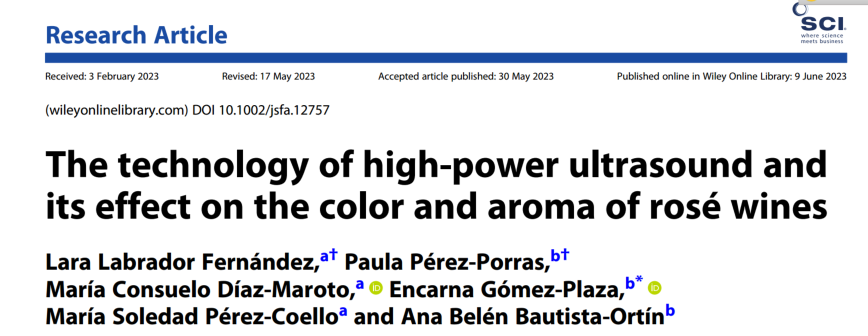 Labrador Fernández, L., Pérez Porras, P., Díaz Maroto, M. C., Gómez Plaza, E., Pérez Coello, M. S., & Bautista Ortín, A. B. (2023). The technology of high‐power ultrasound and its effect on the color and aroma of rosé wines. Journal of the Science of Food and Agriculture, 103(13), 6616-6624.