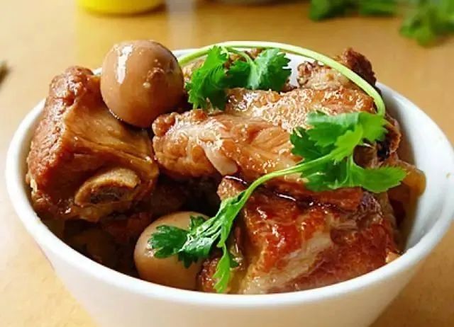 排骨适量、啤酒听装一只、鹌鹑蛋适量、姜片适量、蒜头适量、生抽一大勺、老抽一大勺、盐适量。