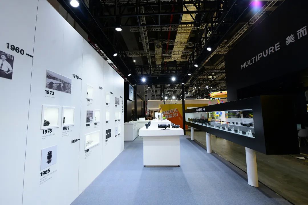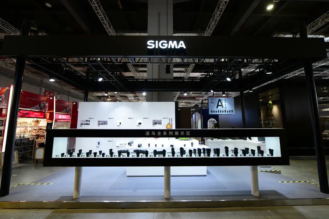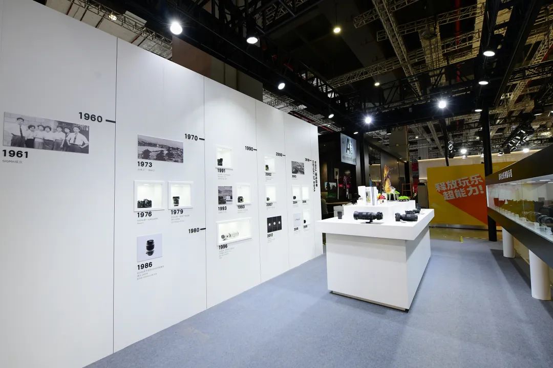 展位一侧的历史墙方便参展观众了解适马的品牌故事。跟随历史墙的时间轴回溯适马发展的变迁历程,可以透过展示窗格内具有重要历史意义的产品知悉适马的每一次革新与突破,并从中体认到适马敢于创新的工匠精神。