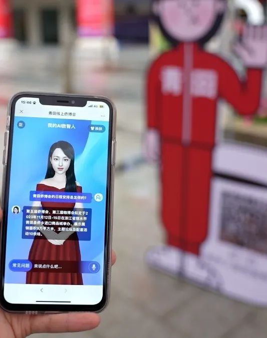 参与形式:在侨博会元宇宙展位,观众按下红色按钮,即可唤醒数字人导游,与数字人进行互动问答,了解青田的历史以及侨博会上的关键信息,增加了本届侨博会的趣味性和参与度。