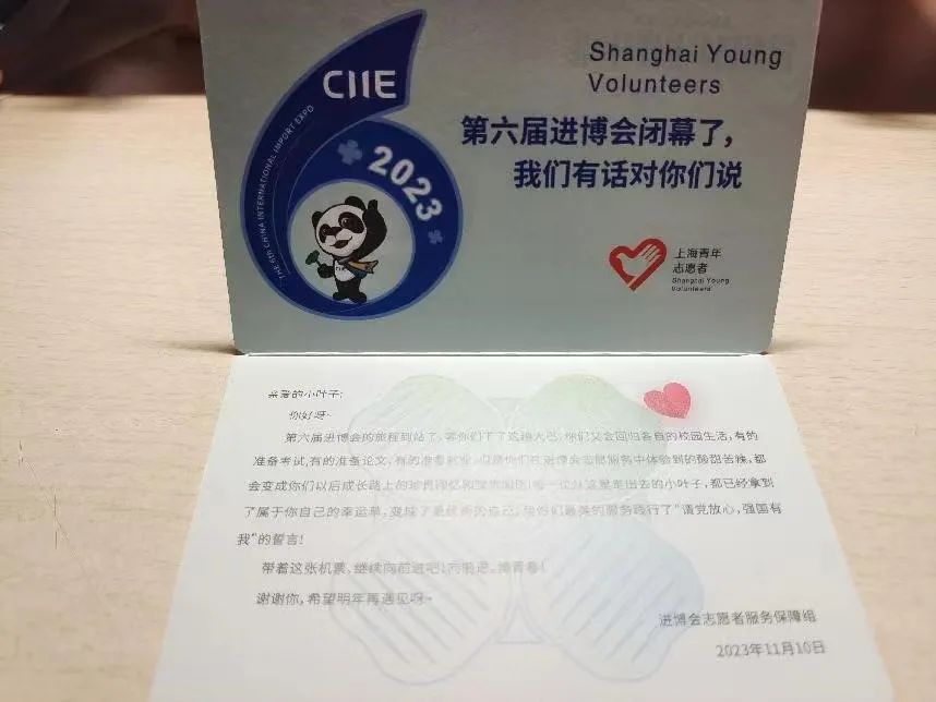 金融学212本科班陈雨春:“这里是上海,梦开始的地方;志愿青春,新时代华章你我共同书写。”这是《青春上海》进博主题曲中的一句歌词,也是在进博会志愿者上岗宣誓仪式上最让我深有感触的一段话。进博期间,我担任辅助管理岗的证件联络员,负责志愿者们证件和进博期间党团活动的摄影对接,同时协助领队做好志愿者们的后勤以及监督工作。虽然迎着晨曦出发,随着落日走回,每日早出晚归是我们的常态,但这并不影响大家对志愿服务的热情,每一位小叶子都以最好的精神状态对待每一次工作。我们在进博中熟悉彼此,认识彼此,一起度过这段充实而又美好的“进博”时光。作为第六届进博会辅助管理岗的一名小叶子,我深感荣幸,在今后的志愿服务中,我会切实做好志愿工作,坚定理想信念,志存高远,脚踏实地,用自己的行动践行“奉献友爱互助进步”的奉献精神。