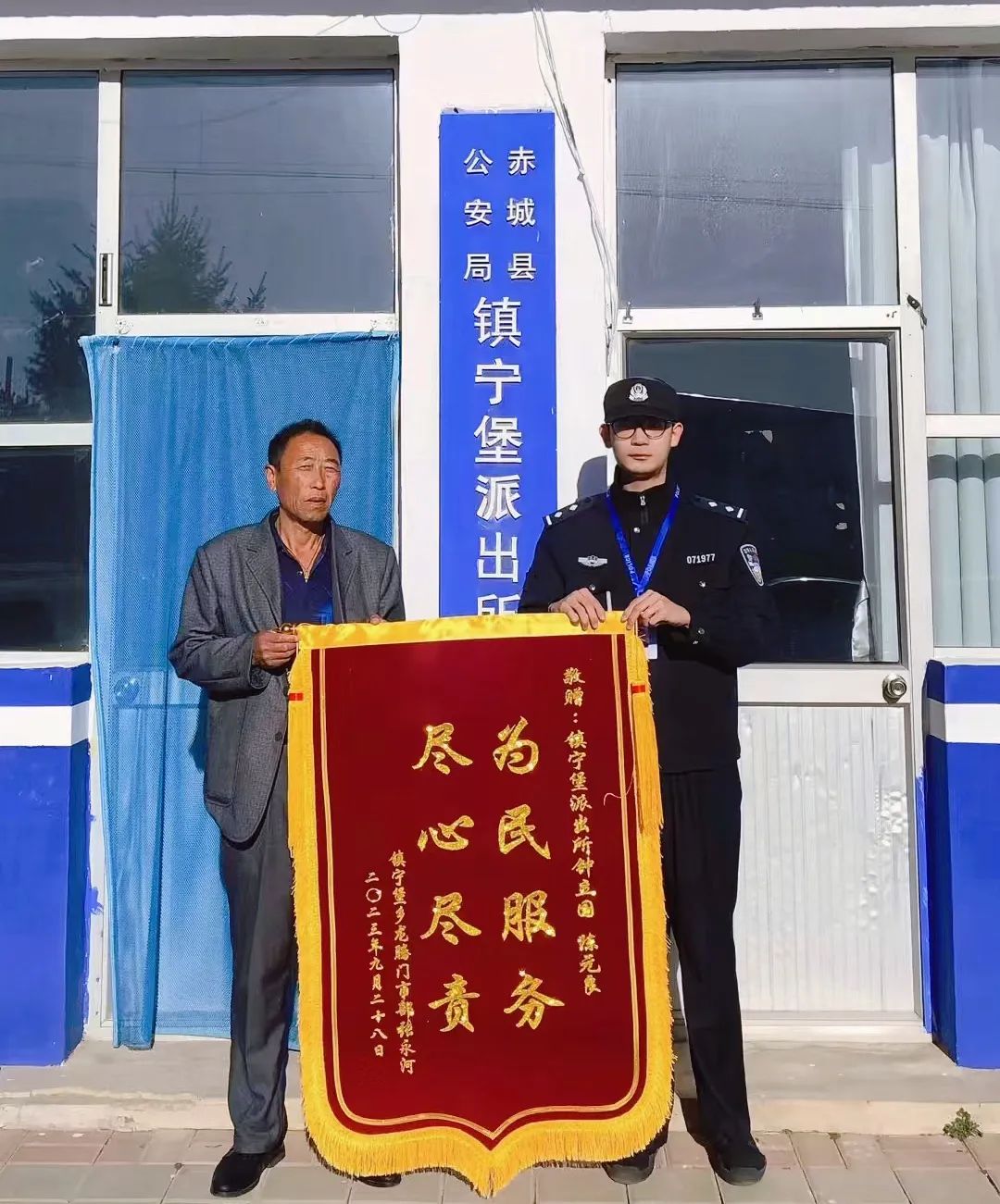 2023年9月28日门市部张哥将一面“为民服务 尽心尽责”锦旗送到镇宁堡派出所,他表示“没想到这么点小事派出所也会管,而且处理的这么好,孩子也受了教育,我们也不用再担心了”。