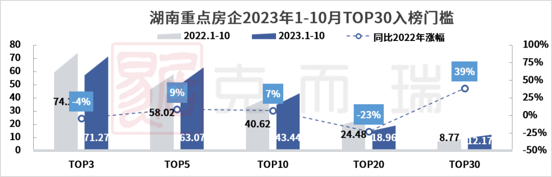 从不同梯队房企销售门槛值的变化来看, TOP3销售金额门槛为71.27亿元,同比跌幅4%。而TOP5、TOP10、TOP30门槛同比有所增长,其中TOP30门槛同比上涨39%,中上游房企地位稳固。