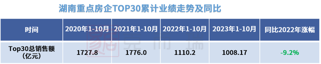 2023年10月,湖南重点房企TOP30实现销售金额约109亿元,环比上涨22%,同比下跌4%。累计业绩来看,TOP30房企1-10月实现销售金额1008.17亿元,仍不及近年同期,同比下跌9.2%。