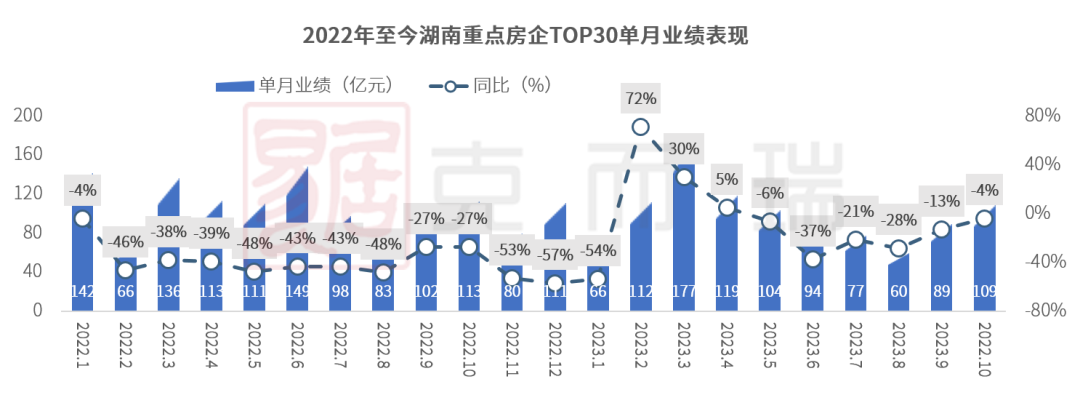 宽松性新政以及双节假期刺激下,房地产市场出现回暖迹象,湖南省重点房企(TOP30)业绩持续环比增长,继9月上涨超五成后,10月再度上涨22%,同比跌幅收窄近1成。特别是头部房企表现稳定,TOP5企业中8成业绩同比上涨。