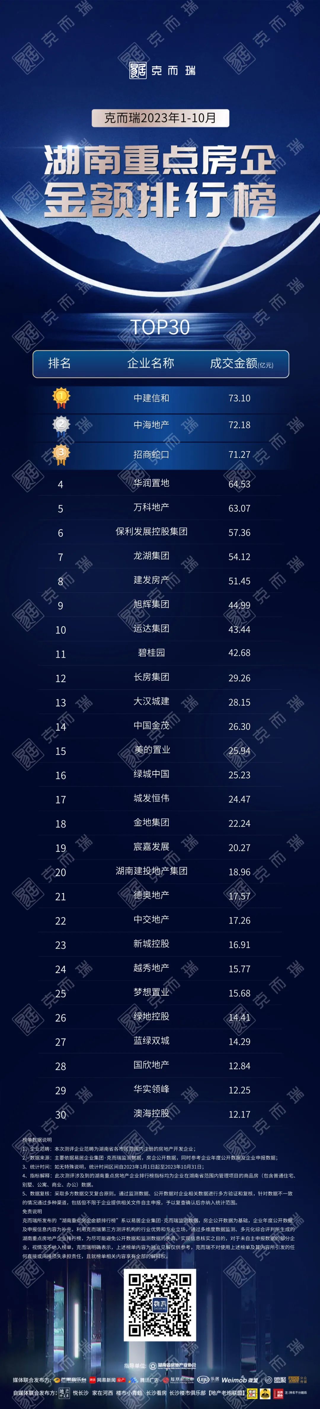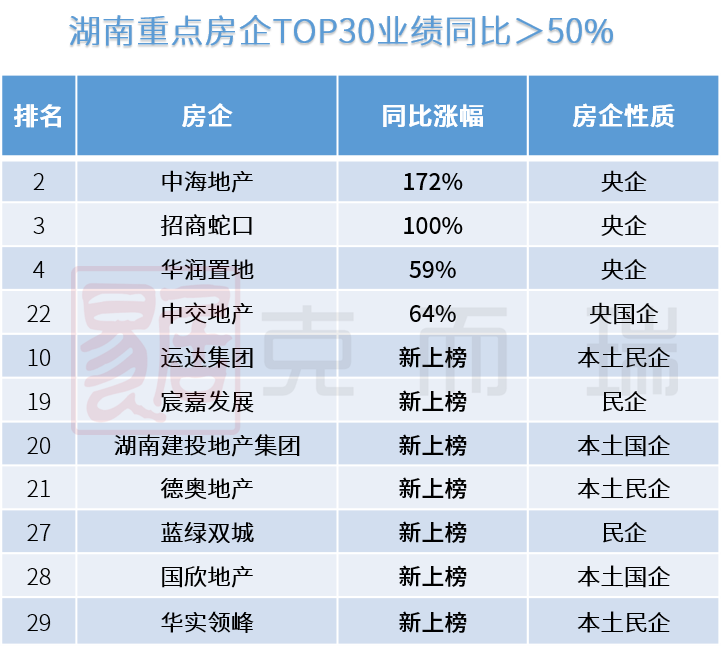 头部房企中,中建信和重回湖南省业绩TOP1,中海地产和招商蛇口业绩同比翻倍增长,排名分别上升16位和8位。