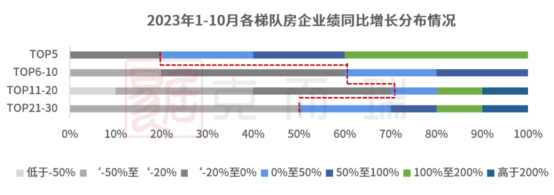 从企业表现来看,2023年1-10月TOP30房企中16家企业累计业绩同比降低,占比53%。
