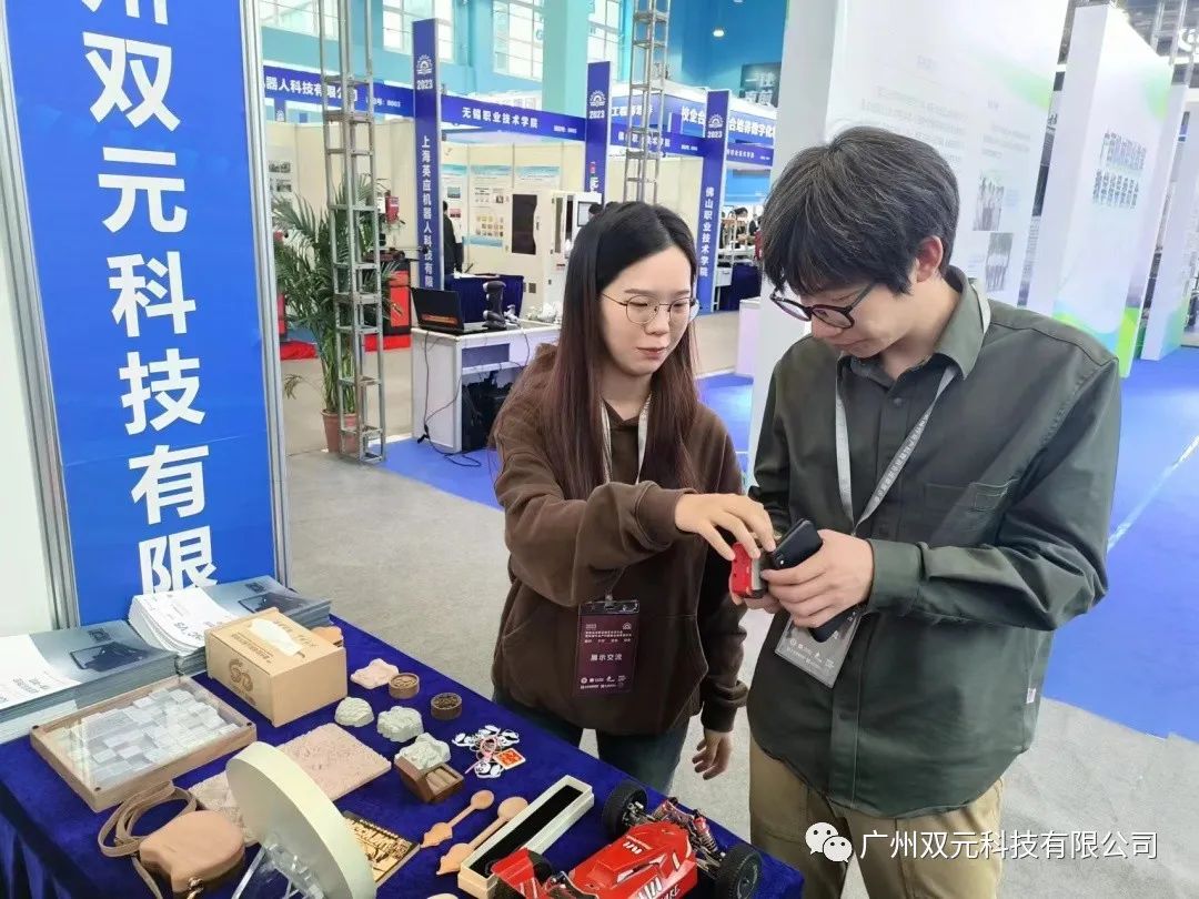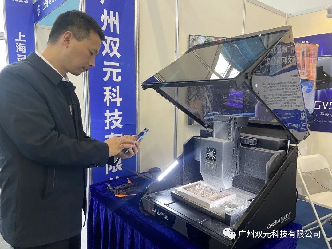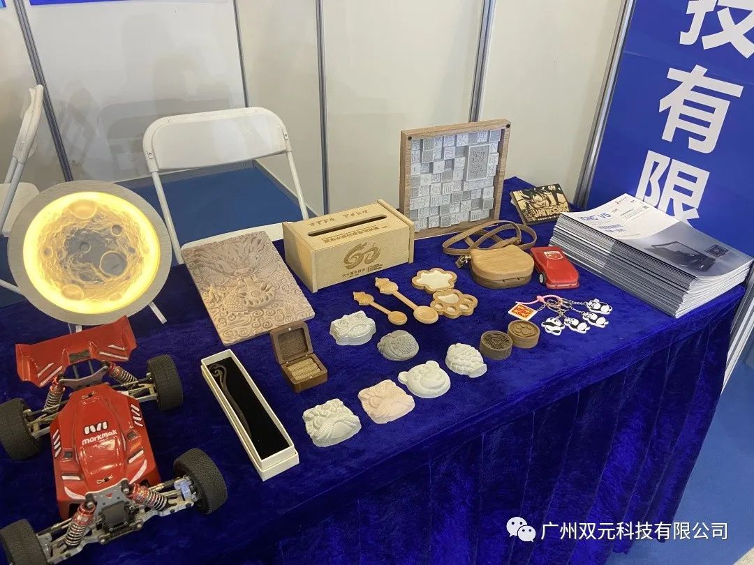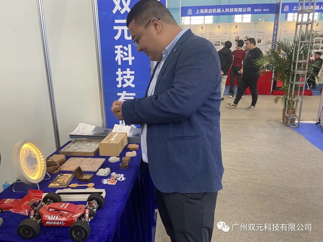 双元科技携经典产品钻石V5亮相,其高度自动化和精致小巧的特点吸引了众多宾客驻足观看。我们展示了多款材质制作的优秀案例,包括碳纤维无人机、月球灯、金钻小车、古风发簪、木质包包、以及龙纹立体浮雕等等。同时,本次展会恰逢常州机电职业技术学院校庆60周年,我们现场为该校制作了个性化纸巾盒,受到了学校和企业的一致好评。
