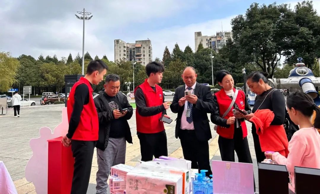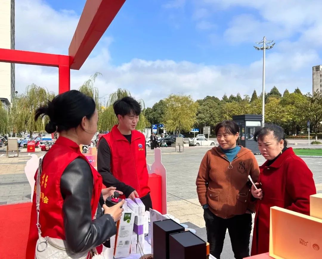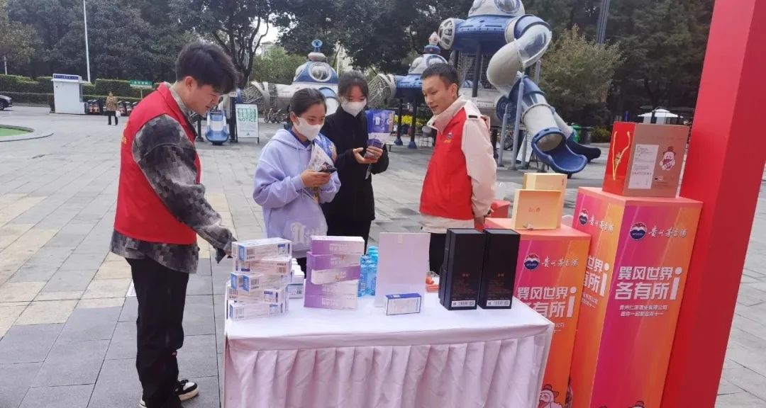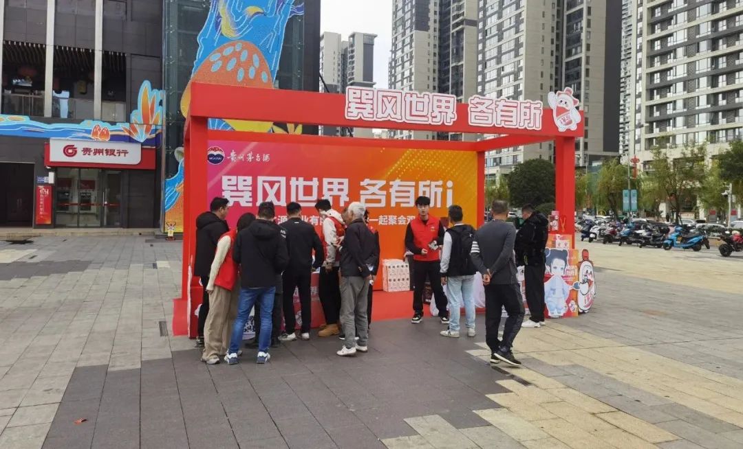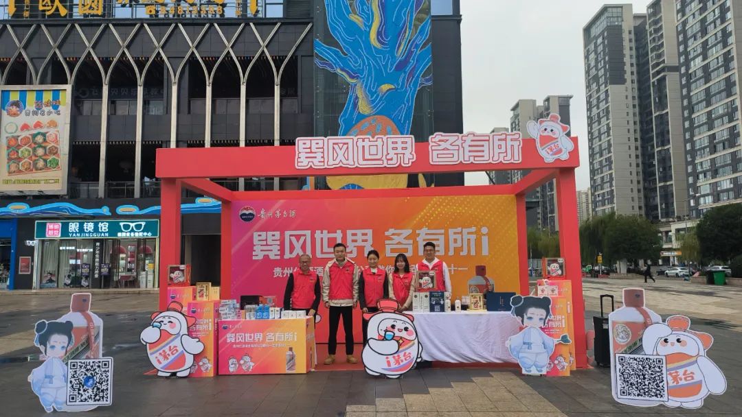 活动现场设在贵阳喀斯特城市广场的户外广场,簇新的展台上摆放着巽风世界和i茅台的宣传品、相关产品,以及专门为消费者准备的各式礼品,红色调的活动主题海报墙在初冬的雨后阳光映照下显得格外温暖。