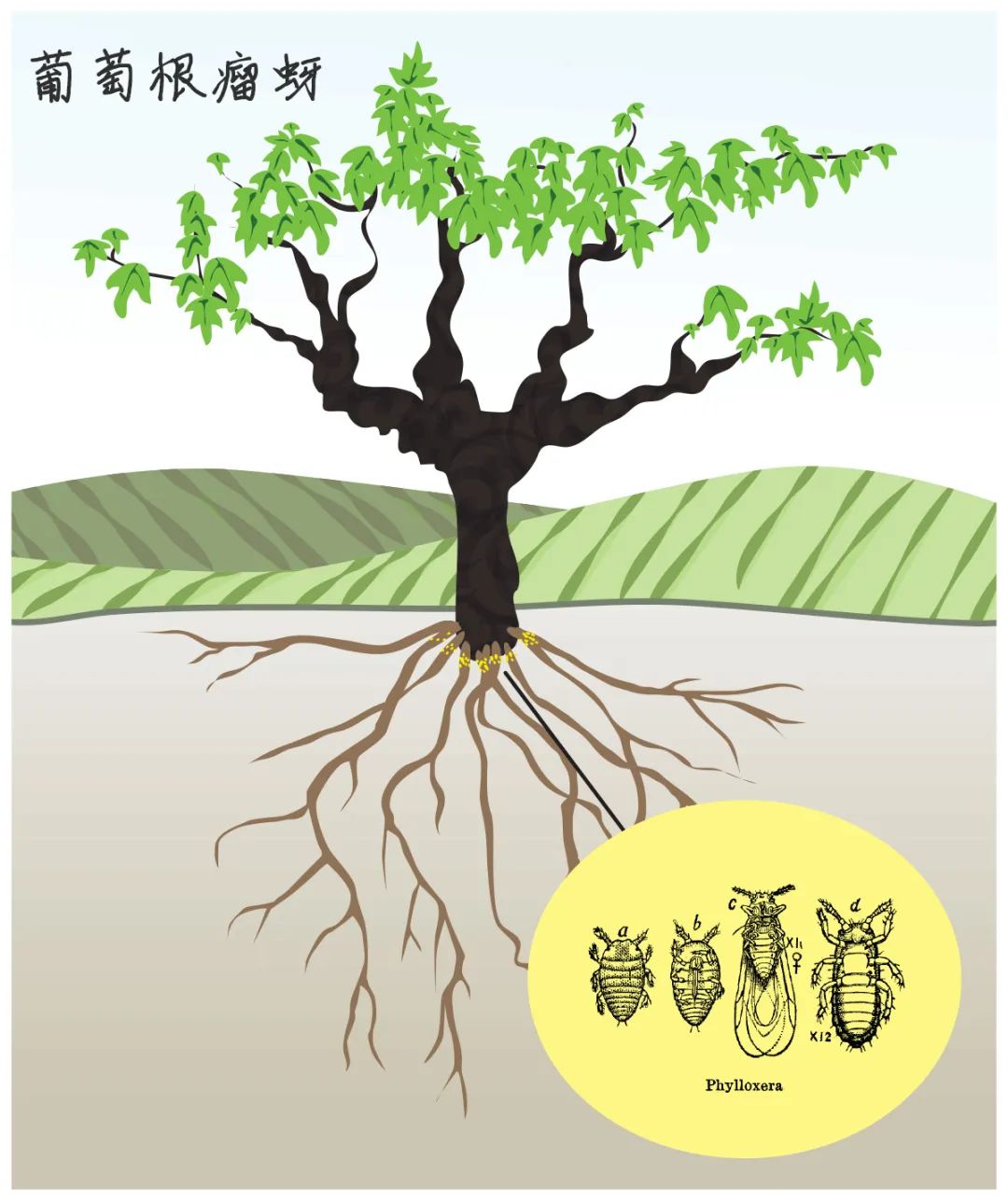葡萄根瘤蚜(Phylloxera)是一种微小的虱子或蚜虫,生活在葡萄根部并吃掉葡萄根。它可以从葡萄园工人的鞋底侵入葡萄园,也可以在葡萄园与葡萄园之间自然传播。