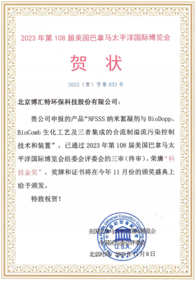 近日,在2023年第108届美国巴拿马太平洋万国博览会中,博汇特NFSSS纳米絮凝剂及与BioDopp、BioComb生化工艺及三者集成的合流制溢流污染控制技术和装置斩获科技金奖!
