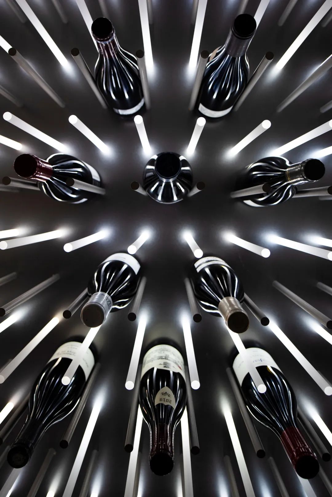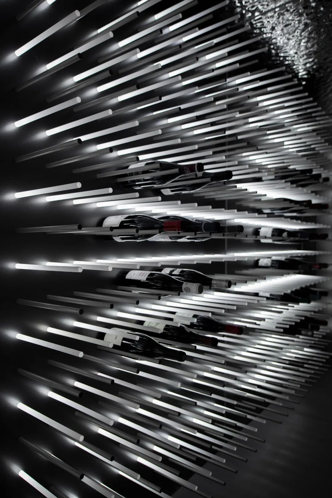 冷库开放式酒架的气氛渲染得益于金属圆棒酒托与亚克力光棒的矩阵式设计,我们根据业主储存酒品的需求,测试了多次之后确定了圆棒的长度、直径以及间隔,然后是光源的呈现方式,最后以磨砂处理的亚克力棒背部打光的方法创造出柔和的点状星云,以满足不伤害酒品的照明展示需求。