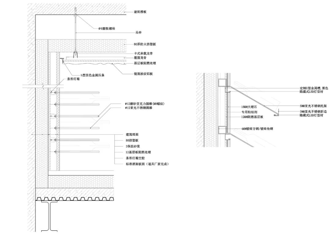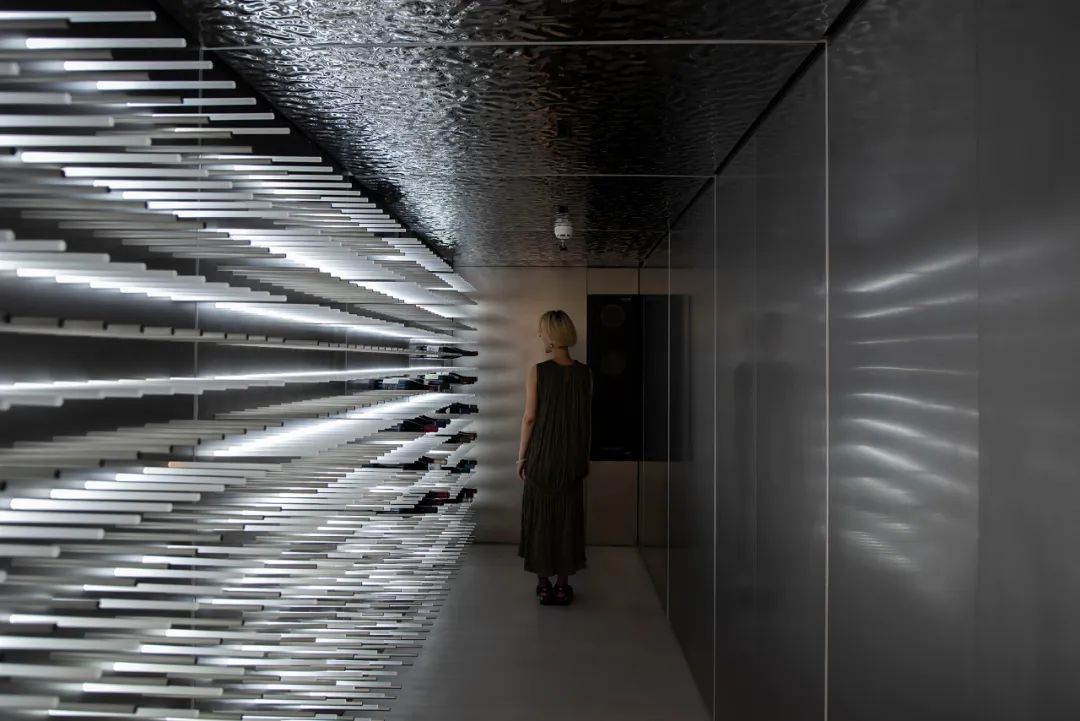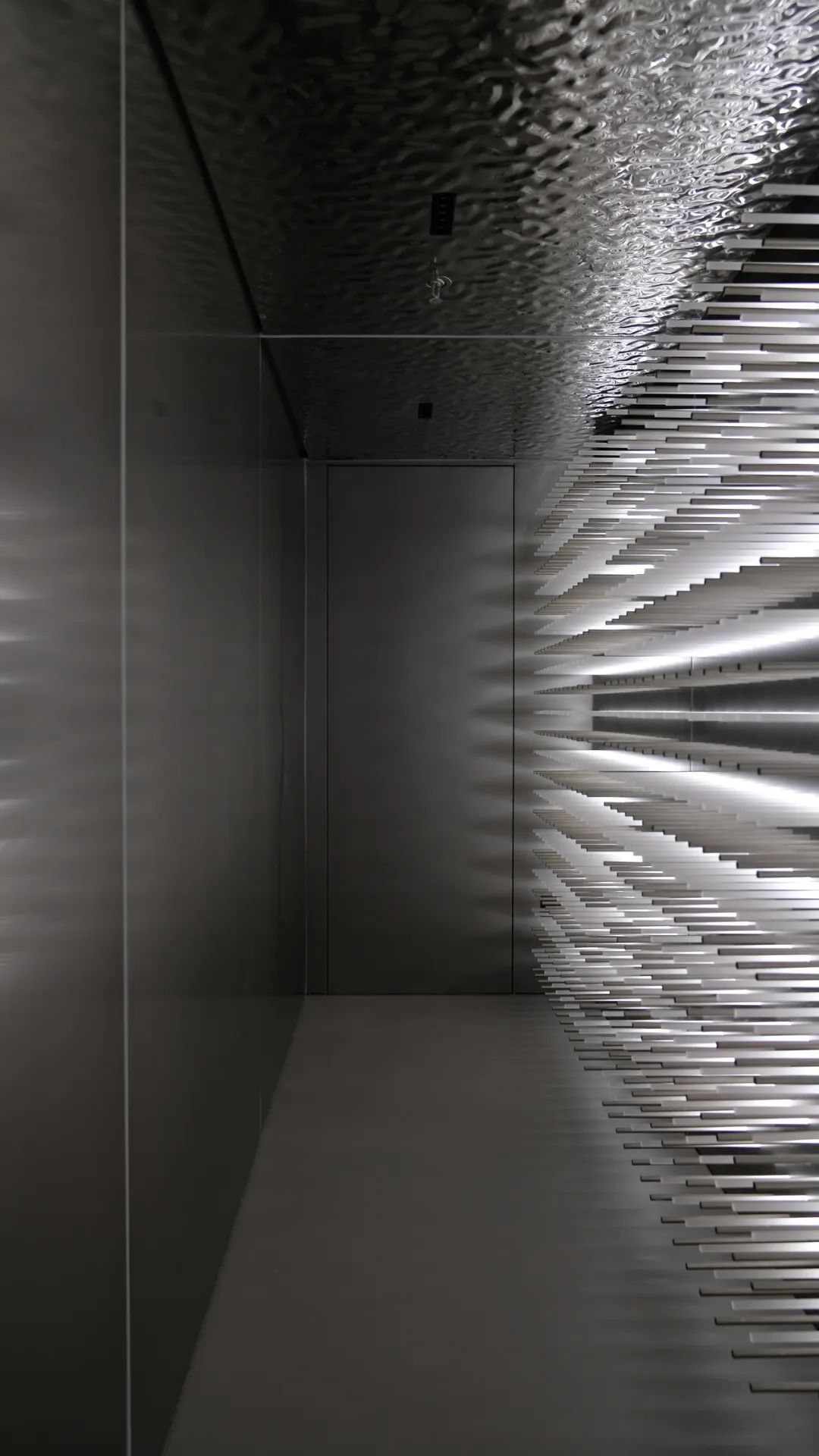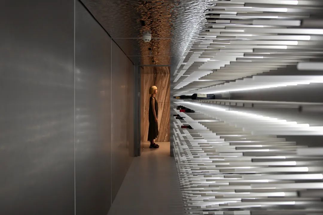 另外,在肌理上我们借由无意义的重复的底纹也强化了抽象性。比如说硅藻泥花费很多人工凿出疏密有致的小洞模拟出洞石的粗粝质感;墙体不锈钢采用的和纹做法以及顶面的波纹镜面不锈钢,都极大地弱化了金属的镜面成像属性,获得了流畅的连贯性;雅致金大理石深深浅浅的斜纹的阵列重复,也是流动性的一种抽象表达。