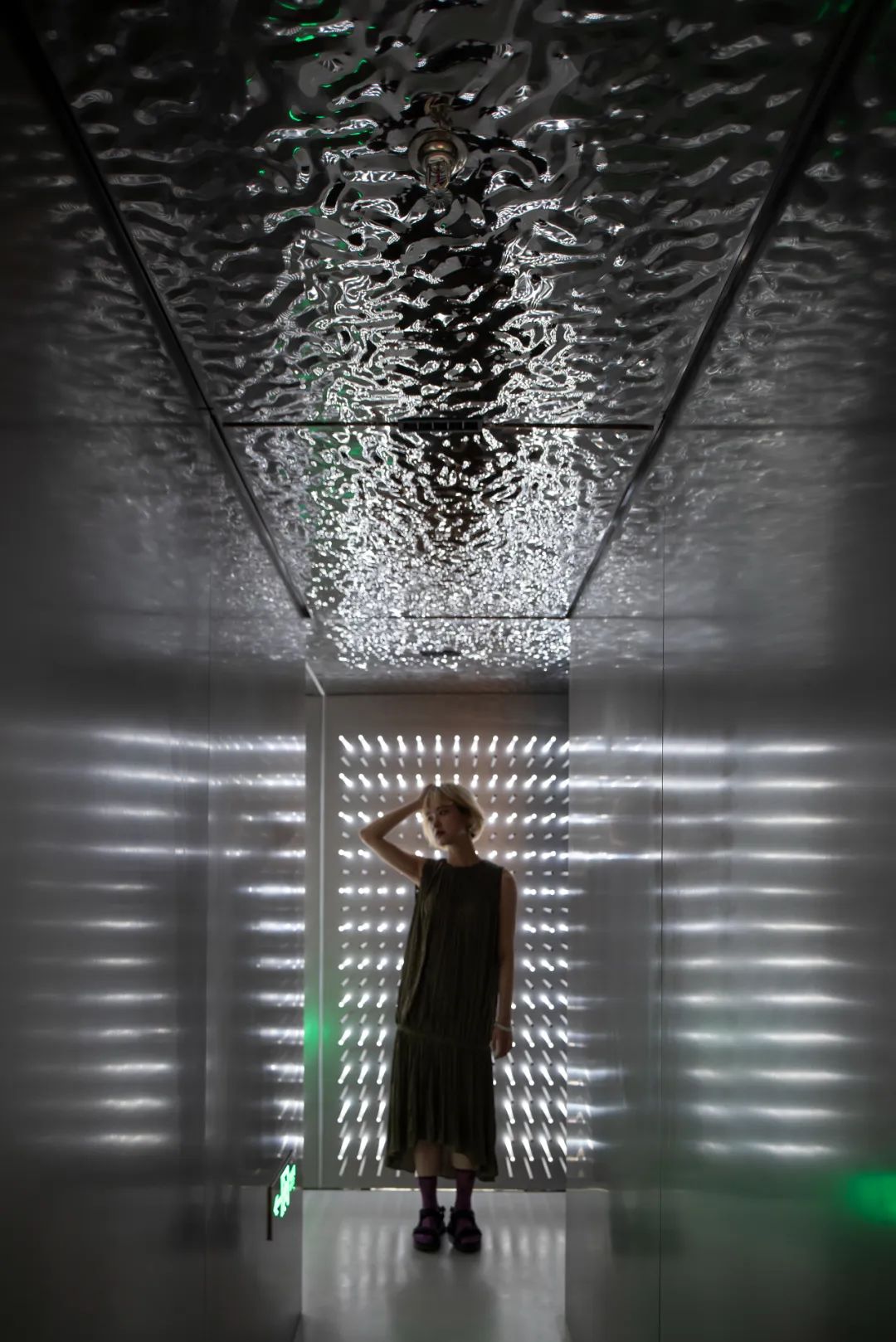 阁楼的灰色微水泥地面,不锈钢墙面和顶面的波纹镜面不锈钢也营造出了一种大面上的平涂效果。