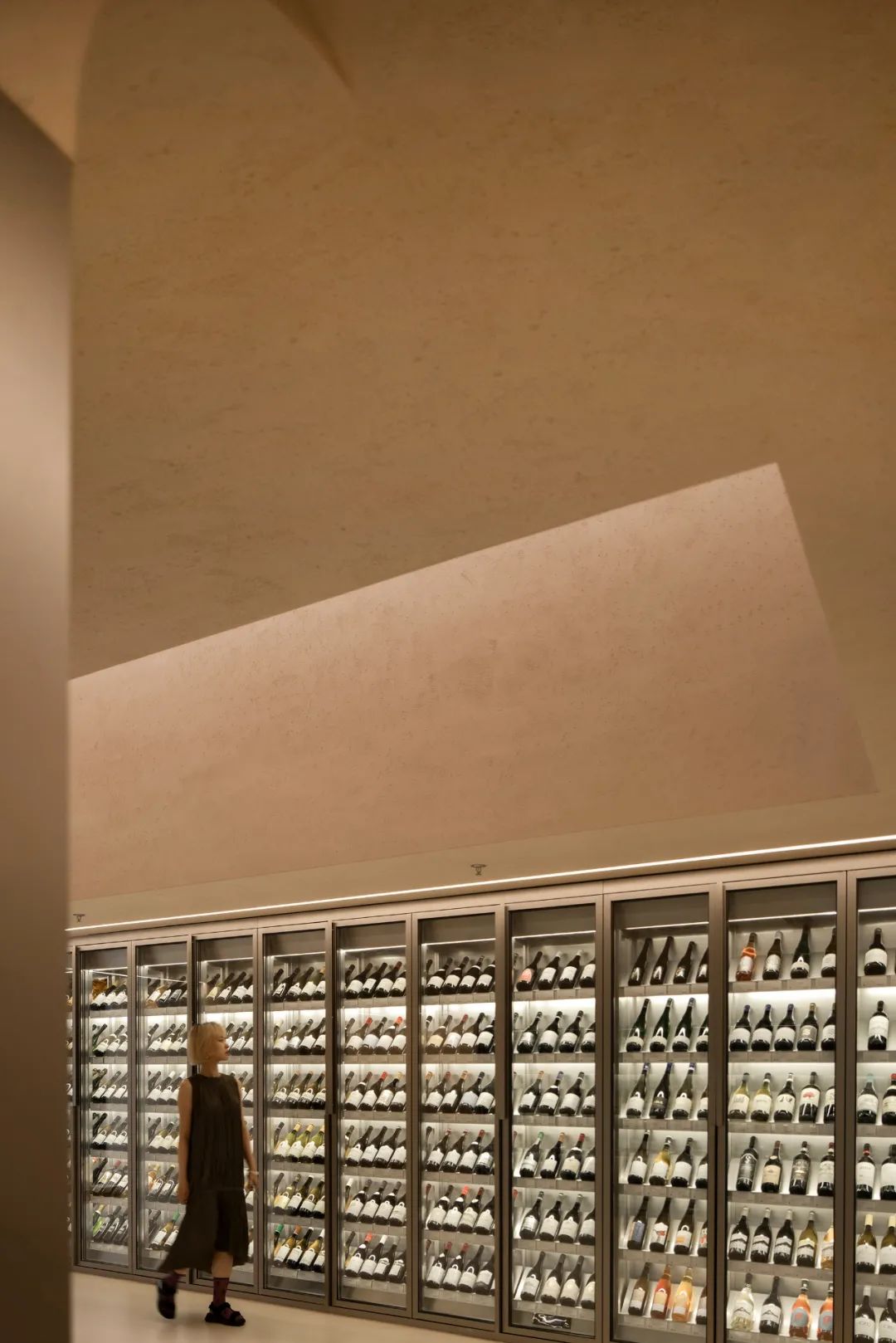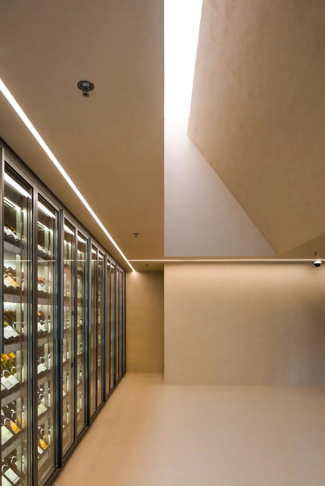 在Caveau de XTD,酒品犹如美术馆的藏品,由于酒对光照非常敏感,灯光的设计既要满足展示,同时又不能对酒品有所损害。三角顶光的设计既满足了主照明和神圣氛围的要求,也避免了对酒柜的直射光;由于酒柜有自己的光源,线条灯仅是作为照明和氛围的补充。一层灯光整体是明亮温暖富有启发性的。