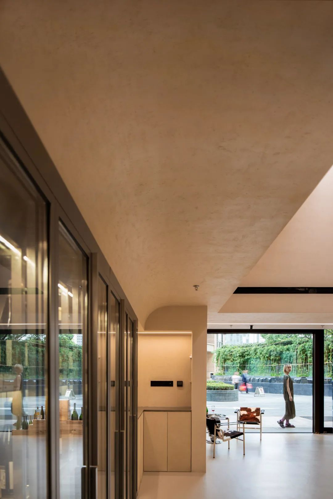在形态上起主导的是方形,构建出一层展示销售区,阁楼存酒廊和珍藏酒窖三个功能性区域。三角形以顶光的面目出现,高耸着侵入阁楼层,复又倾泻而下,神圣光芒定义出美术馆的气质;圆形被分解,只出现了1/4的弧,以顶与墙的衔接者完成了空间角色。