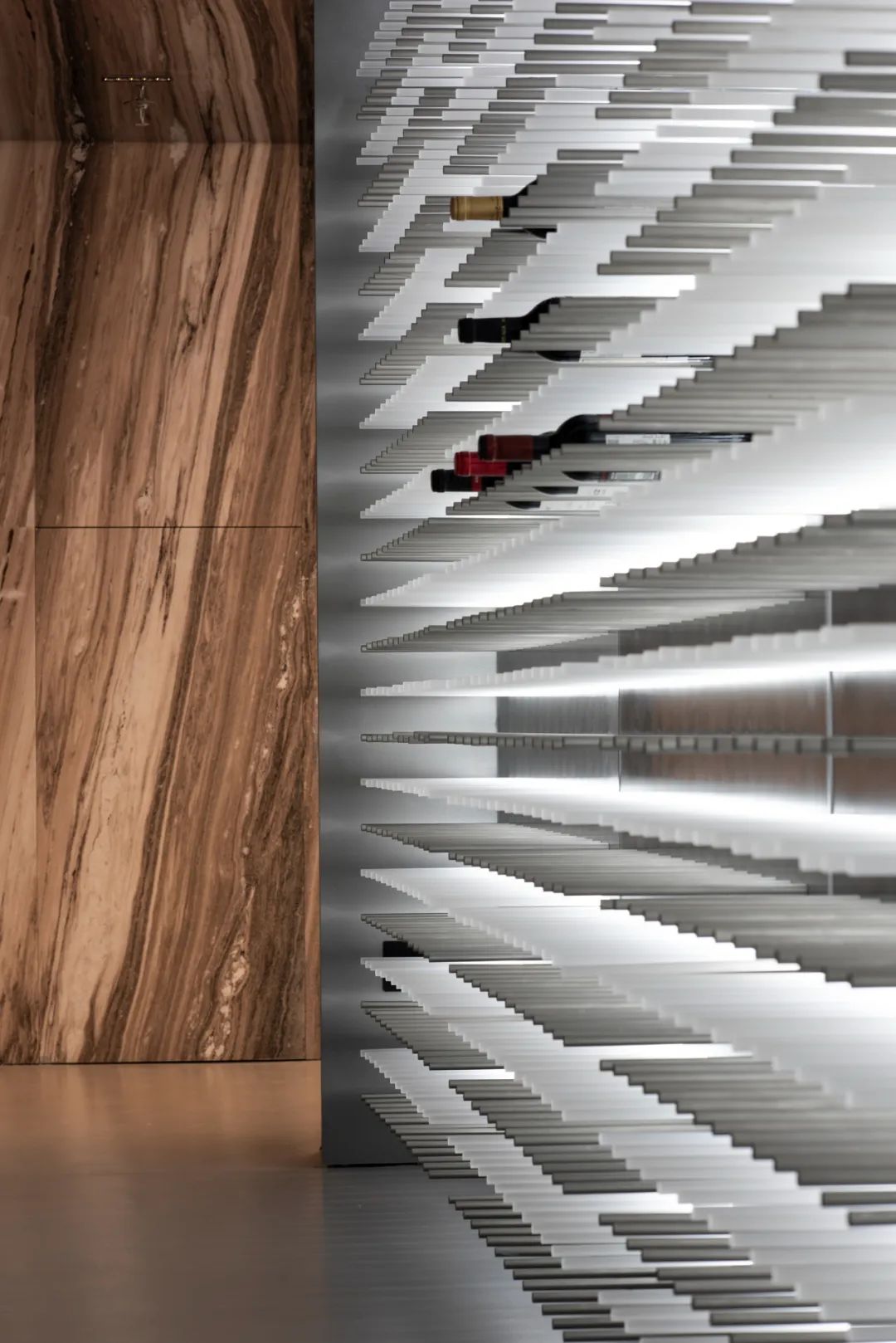 珍藏酒窖内的大理石墙面和不锈钢开放式酒架(©宋肖澹)