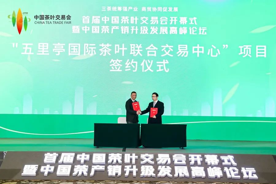 开幕式现场,中国优质农产品开发服务协会与福州振兴乡村集团签订合作协议,共同开展五里亭国际茶叶联合交易中心项目建设,力争将五里亭茶叶交易市场打造成国际茶叶联合交易中心。