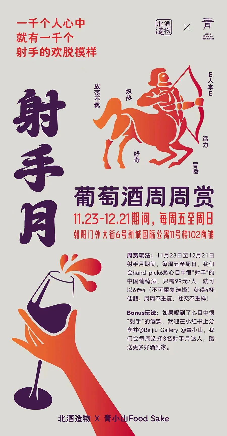 Bonus玩法:如果喝到了心目中很“射手”的酒款,欢迎在小红书上分享并@Beijiu Gallery @青小山,我们会每周选择3名射手月达人,赠送更多好酒到家。