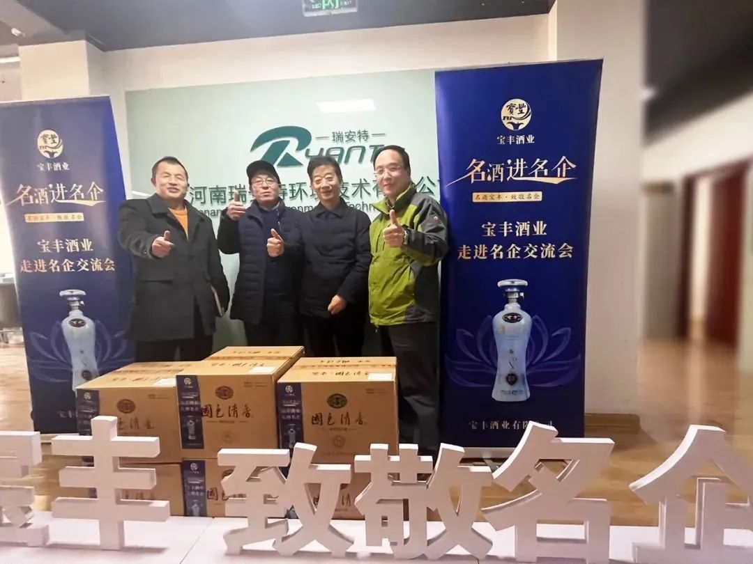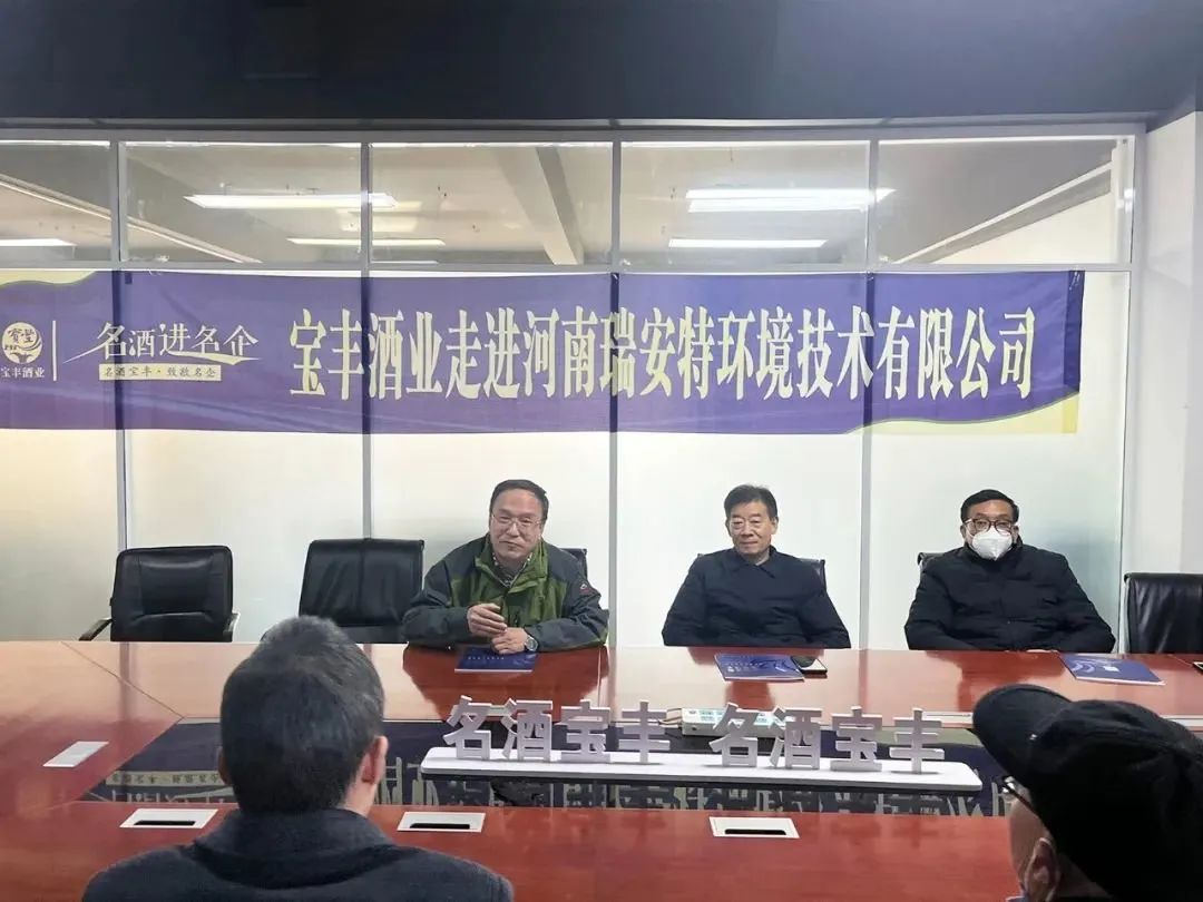 2022年12月,宝丰酒业携手宝丰酒合作伙伴——荥阳市劲致源商贸有限公司(简称劲致源)共赴河南瑞安特环境技术有限公司(简称瑞安特),开展三方合作交流会议。劲致源总经理朱振江、郑州大区新郑办事处主管靳保国等共同前往,瑞安特董事长高志伟、总经理刘尧等领导陪同。