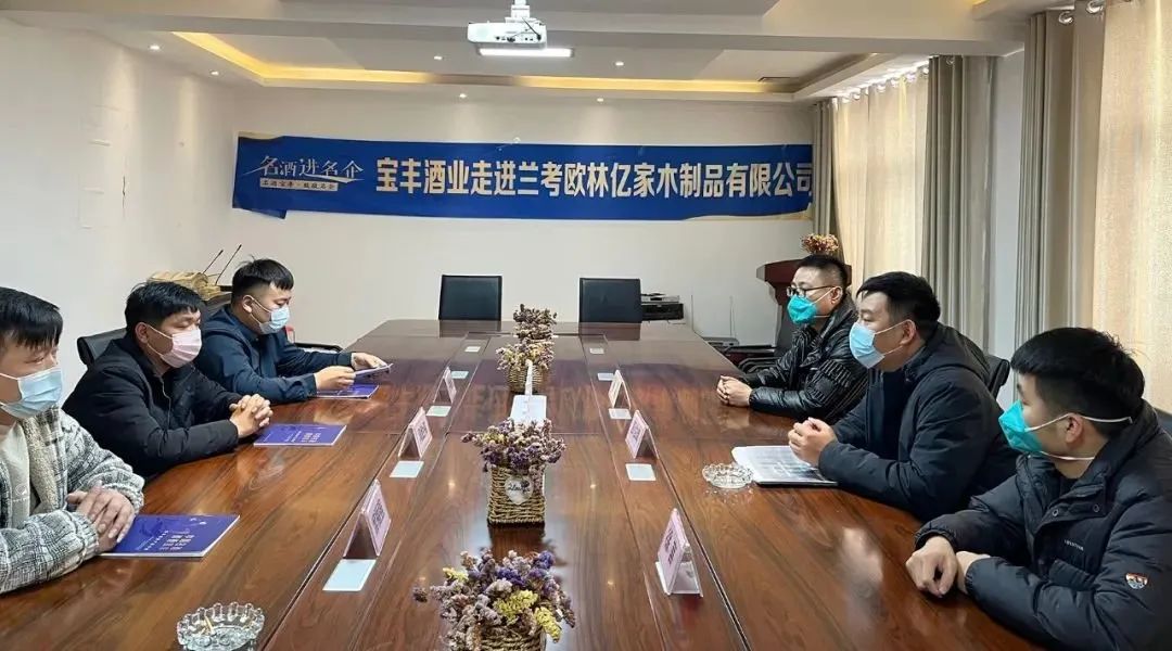 2022年12月,宝丰酒业销售公司开封办事处主管慕俊峰等一行到兰考欧林亿家木制品有限公司(简称欧林亿家)参观交流。欧林亿家董事长周胜伟、总经理席福强、销售总监许百会等领导陪同座谈及参观。