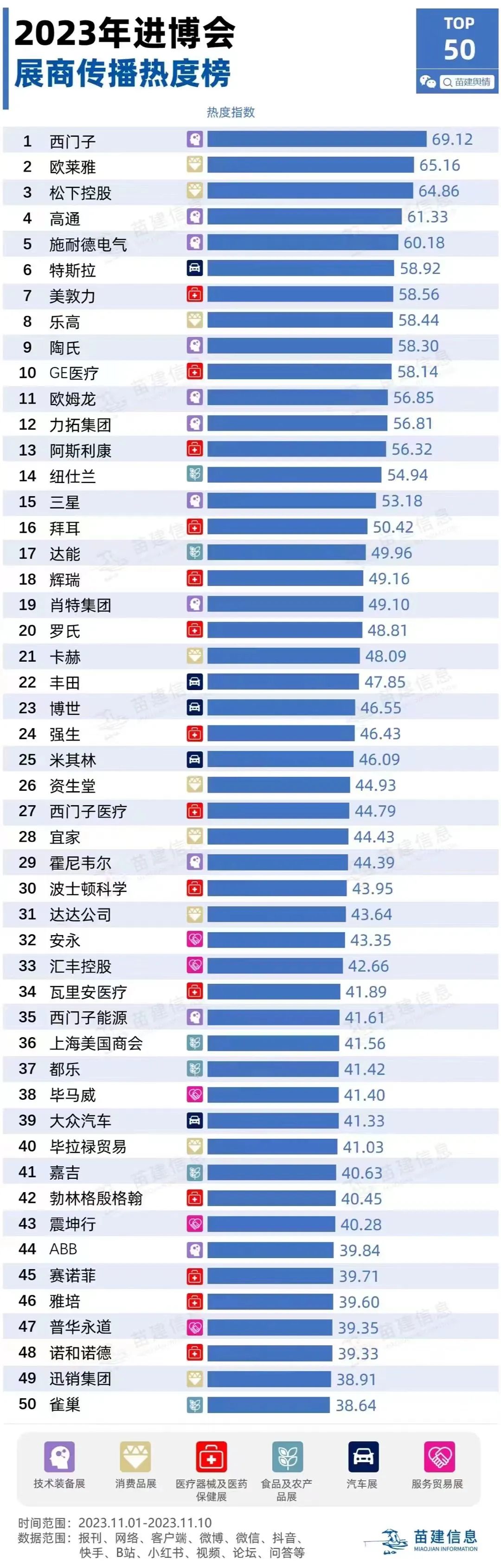 六年来,进博会与全球企业双向奔赴,虹桥国际商务区作为进博会的永久主办地和进博溢出效应最直接的承载区,区域范围内企业也得到了前所未有的关注。根据舆情监测数据显示,从11月1日到10日间,通过纸媒、电媒、网媒、视频网站等多渠道曝光度收集,第六届进博会展商传播热度榜上,纽仕兰、博世、米其林、宜家、毕马威、震坤行等多家虹桥企业进入前50,涵盖食品及农产品展、汽车展、消费品展、医疗器械及医药保健展、服务贸易展等几乎所有门类,虹桥元素在进博宣传中开启“霸屏”模式。