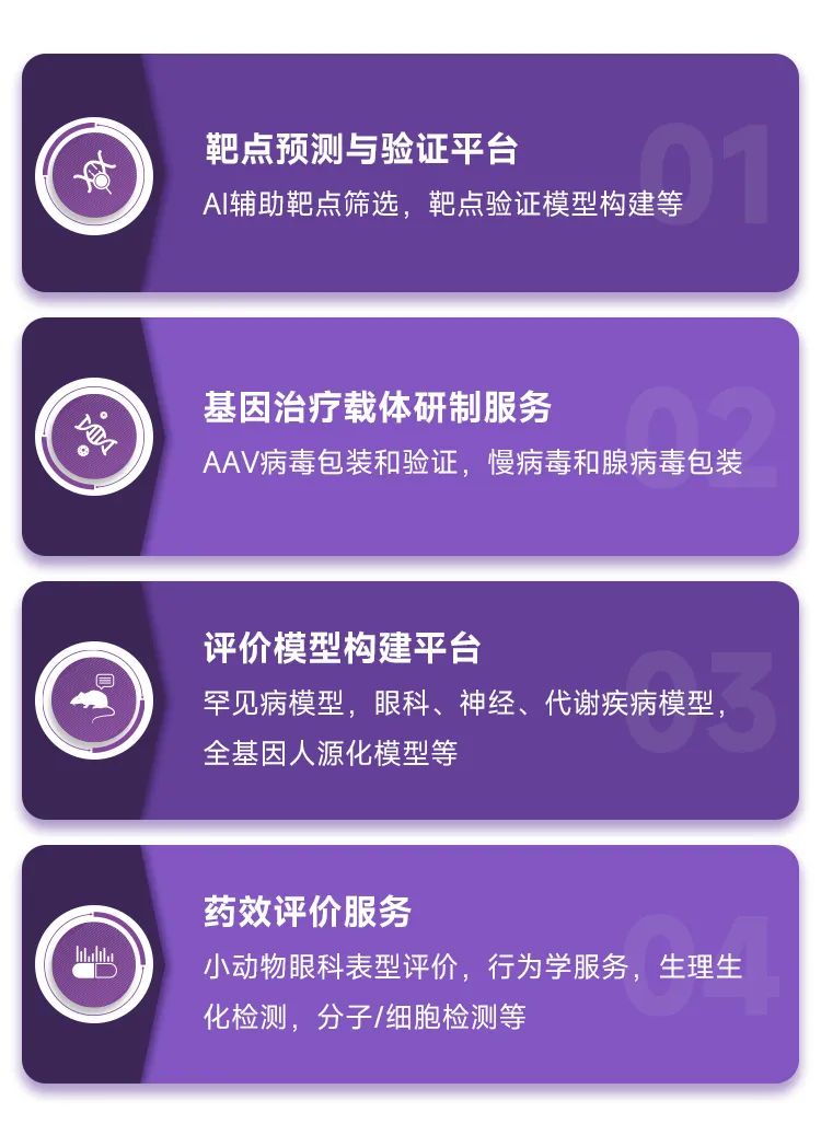 赛业生物基因治疗一站式解决方案可为从事基因治疗的研究者提供更高效的基因功能解析与基因治疗一站式整体解决方案,包括靶点筛选与功能研究,动物模型构建和病毒载体如AAV、LV、ADV等设计与包装,以及表型分析等全流程服务。