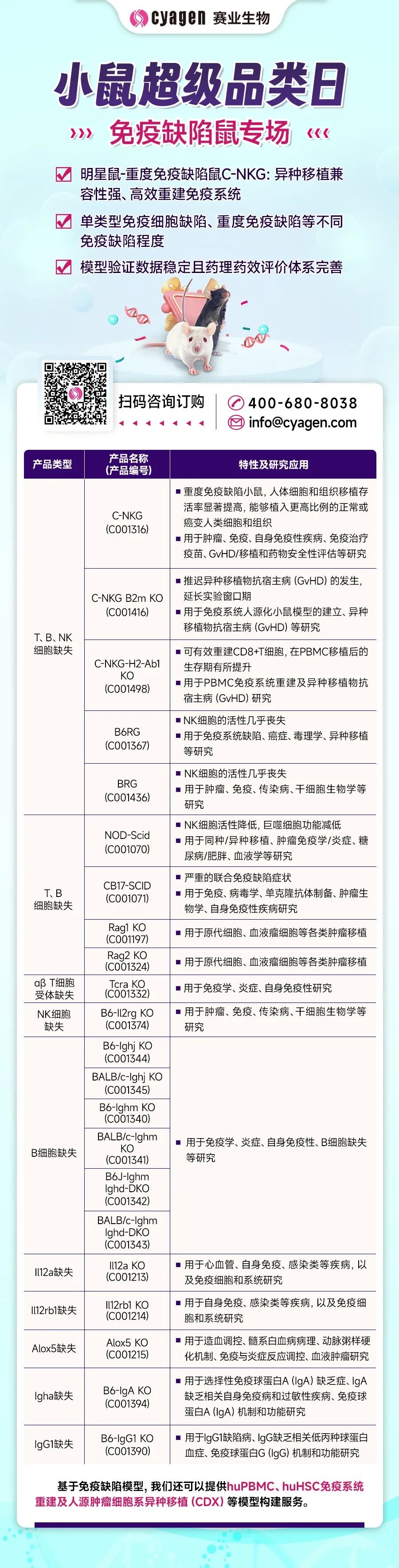赛业生物携细胞治疗CRO服务平台、基因治疗CRO服务平台及相关模型定制服务精彩亮相。赛业生物细胞治疗CRO服务平台提供从抗体开发、CAR病毒制备、免疫细胞制备和表型检测、细胞模型与动物模型的构建,到体外/体内药效评价的全流程服务。基因治疗CRO服务平台可为从事基因治疗的研究者提供更高效的基因功能解析与基因治疗整体解决方案,包括靶点预测与验证研究,动物模型构建和病毒载体如AAV、LV、ADV等设计与包装,以及有效性评价等全流程服务。