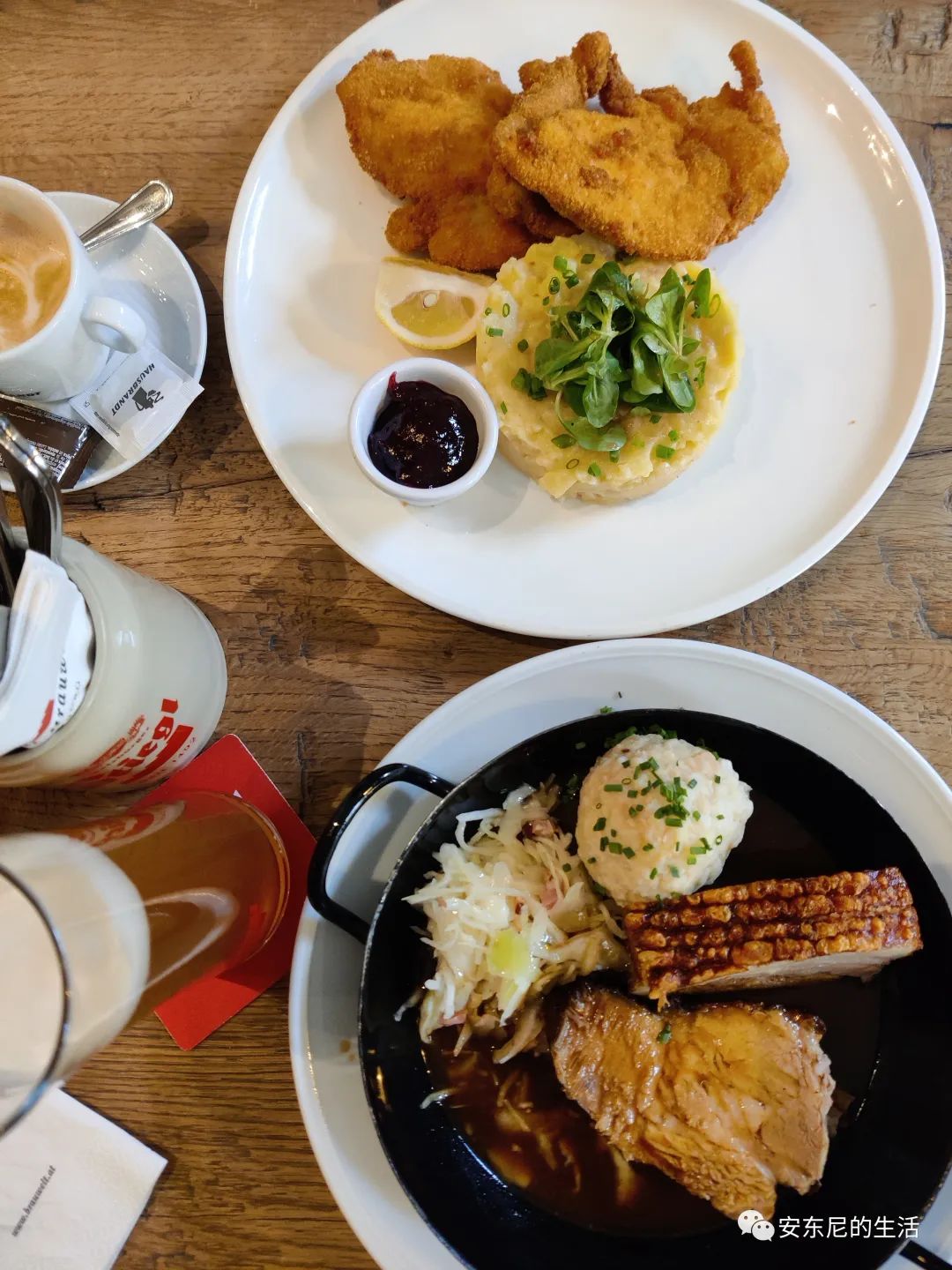 说回Stiegl-Brauerei,新酒厂自带的啤酒餐厅规模也是相当大,分为三个大厅,餐食虽说是中规中矩的德奥风味: 脆皮五花肉的脆皮根本咬不动,调味异常简单的炸鸡竟然异常好吃,以至于炸鸡都成了萨尔茨堡的一道招牌(有兴趣的朋友可以去Bärenwirt,尝尝奥地利最好吃的炸鸡),总的来说体验比慕尼黑那几家要好得多。
