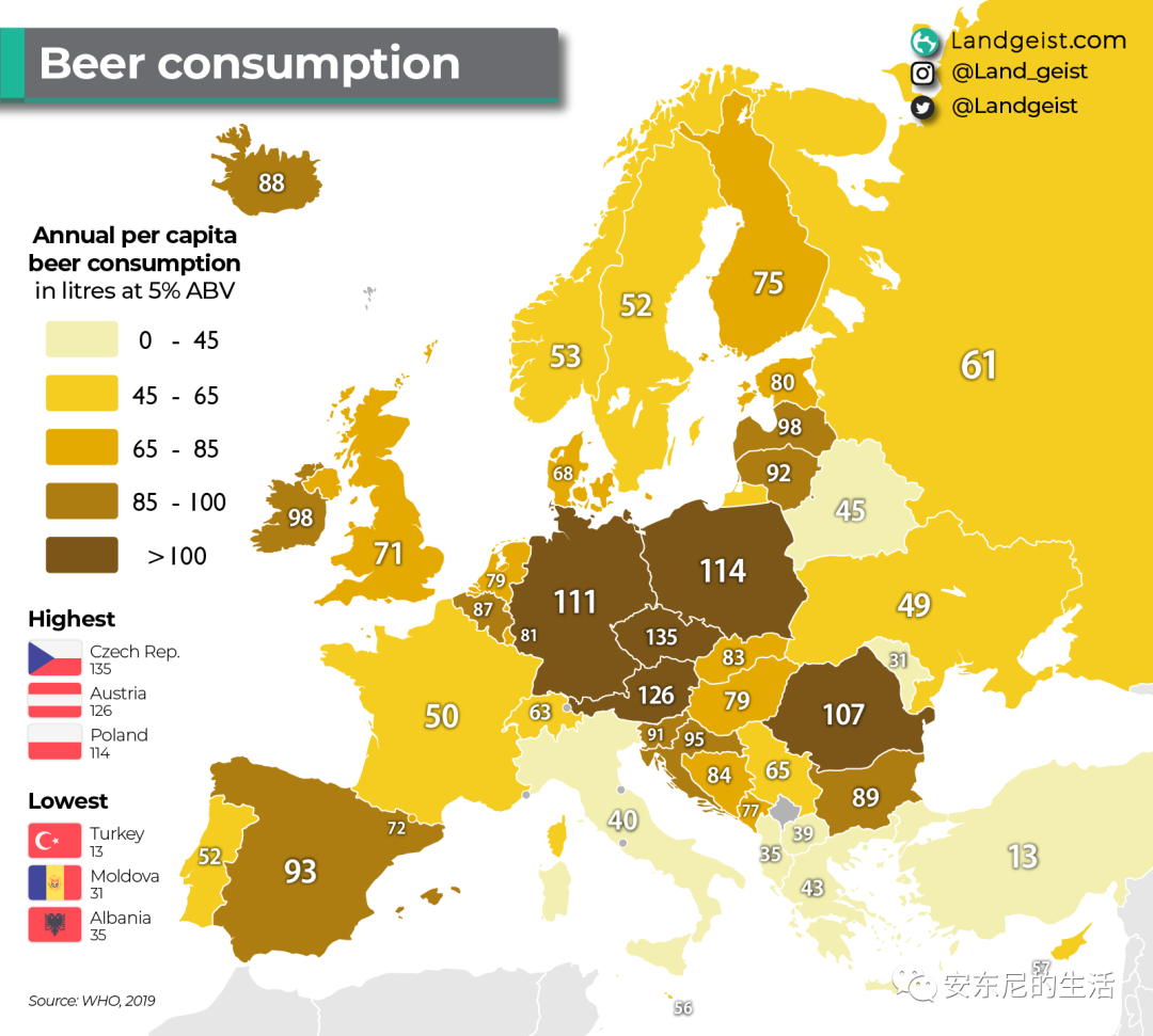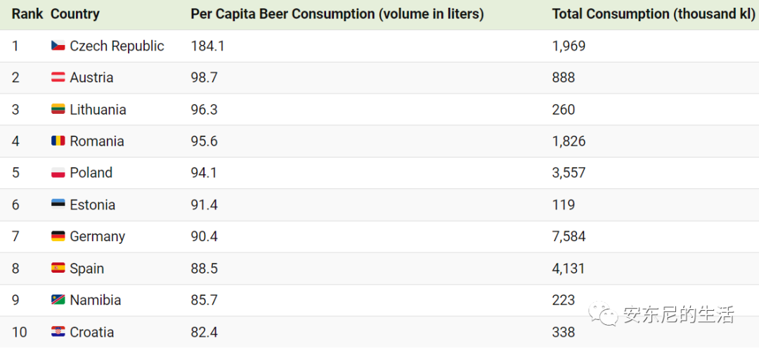 中欧地区一直以来就以纯净的高品质啤酒闻名全球,捷克,德国,奥地利三国也常年霸占人均啤酒消费量榜单前三。
