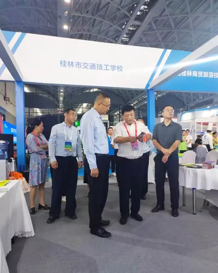 在展会期间,人力资源和社会保障部职业能力建设司二级巡视员张达、自治区人力资源和社会保障厅厅长唐标文、副厅长辛卫红、副厅长覃朝俊、桂林市人民政府副市长莫一格、桂林市人社局党组书记、局长、市委组织部副部长(兼)唐德华、桂林市委组织部副部长孙志武、桂林市人社局副局长欧阳凯等领导莅临我校展位参观指导。校长向各位领导介绍了我校的办学特色、校园文化建设、各级技能大赛承办情况及高技能人才培育成果,重点介绍了我校汽车维修专业的先进的实训教学装备,并对部分高科技设备如汽车测试仪器的使用现场进行讲解和演示,汇报了我校与桂林旅游股份有限公司共建产业学院的新项目。