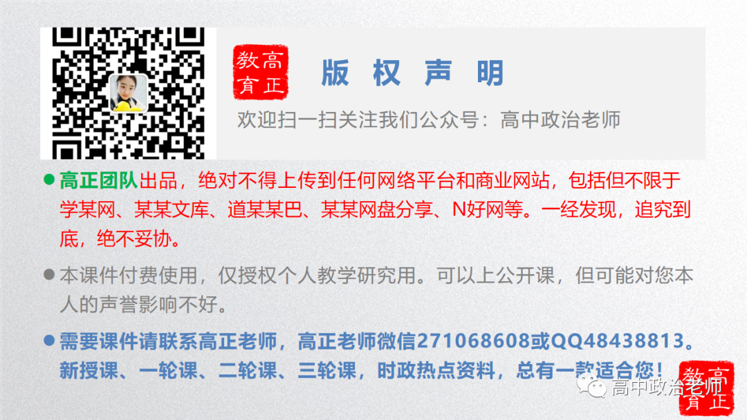 高正团队2023选必1《当代国际政治与经济》新授课课件正在制作中,均依据2023最新版教材制作主要内容为课件+相关视频+教学设计+配套练习。每周制作两个,请注意制作进度!如有需要可以联系高正老师微信号271068608或扫描下面二维码。