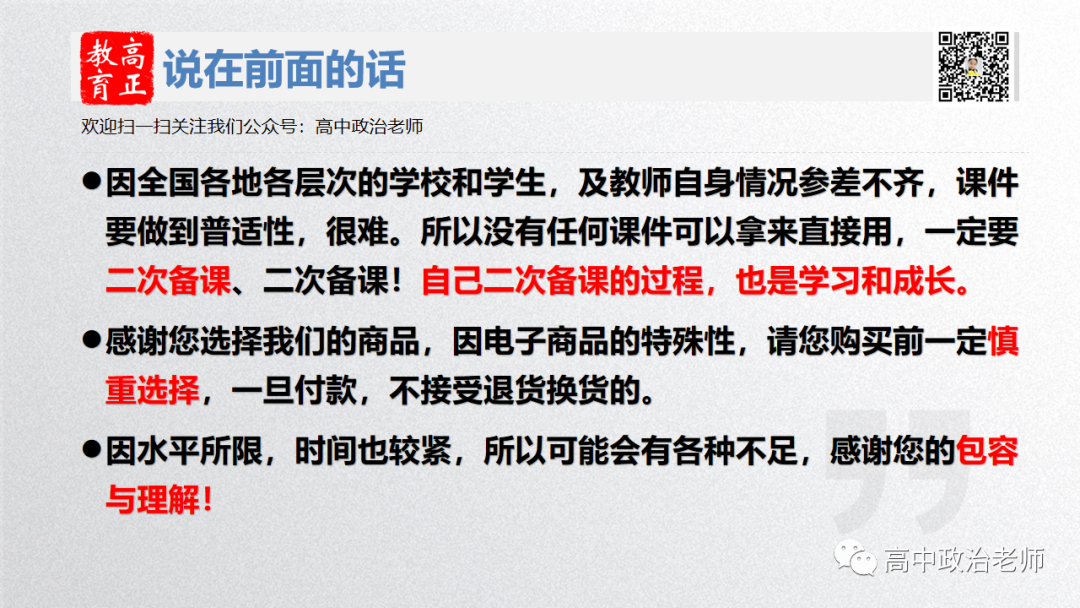 2.高正团队选必三《逻辑与思维》新授课、2024高三统编版一轮和新授课的《中特》《经社》《政法》《哲文》选必二《法律与生活》《选必三》均已全部完工,主要内容为课件+相关视频+配套练习,新授课课件还有配套教学设计。
