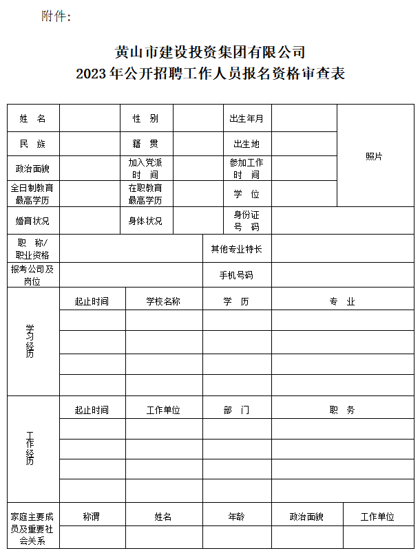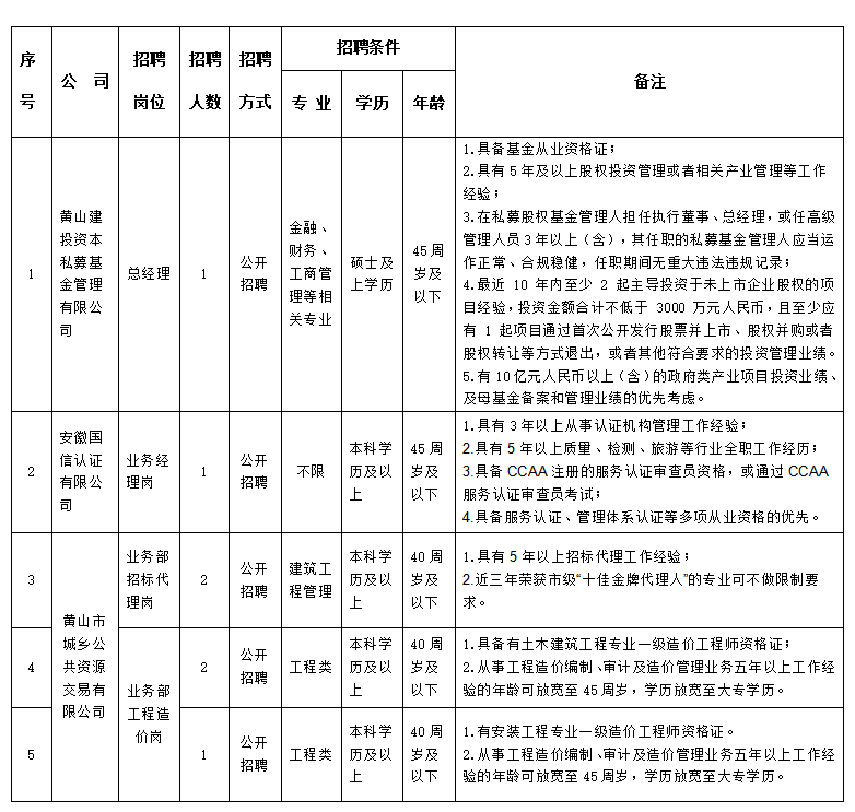 根据工作需要,黄山市建设投资集团有限公司拟面向社会公开招聘部分权属公司工作人员,现就有关招聘事项公告如下:根据市委市政府部署,2023年3月31日,黄山市建设投资集团有限公司正式挂牌成立,定位为市属一级国有资本投资和运营公司,注册资本50亿元,拥有权属公司近90家,主要承担着城乡建设投融资、城市综合运营、战略性新兴产业投资发展、园区片区综合开发运营4大主体职能,聚焦厚植城乡建设、现代服务业、物流贸易、能源资源、战新投资等5个主业板块优势。“年龄条件”中45周岁以下”为“1977年10月31日以后出生”,“40周岁以下”为“1982年10月31日以后出生”,以此类推。1.公告中涉及的工作年限计算截止时间为2023年10月31日。2.应聘人员的学历(学位)必须为国家承认的学历学位证书,资格审查以学历证登记为依据,对有疑义的学历学位证书,以国家教育部认定的结果为准。4.经政府人力资源和社会保障部门认定具有考试违纪行为且在停考期内的人员;5.曾因犯罪受过刑事处罚的人员和曾被开除公职的人员、受到党纪政纪处分期限未满或者正在接受纪律审查的人员、处于刑事处罚期间或者正在接受司法调查尚未作出结论的人员。(八)有以下情况的人员不予报考黄山建投资本私募基金管理有限公司总经理岗位:1.最近 3 年因重大违法违规行为被金融管理部门处以行政处罚;2.被中国证监会采取市场禁入措施,执行期尚未届满;3.最近 3 年被中国证监会采取行政监管措施或者被协会采取纪律处分措施,情节严重;4.对所任职的公司、企业因经营不善破产清算或者因违法被吊销营业执照负有个人责任的董事、监事、高级管理人员、执行事务合伙人或其委派代表,自该公司、企业破产清算终结或者被吊销营业执照之日起未逾 5 年;5.因违法行为或者违纪行为被开除的基金管理人、基金托管人、证券期货交易场所、证券公司、证券登记结算机构、期货公司等机构的从业人员和国家机关工作人员,自被开除之日起未逾 5 年;6.因违法行为被吊销执业证书或者被取消资格的律师、注册会计师和资产评估等机构的从业人员、投资咨询从业人员,自被吊销执业证书或者被取消资格之日起未逾 5 年;7.因违反诚实信用、公序良俗等职业道德或者存在重大违法违规行为,引发社会重大质疑或者产生严重社会负面影响且尚未消除;对所任职企业的重大违规行为或者重大风险负有主要责任未逾 3 年;8.被终止私募基金管理人登记的机构的控股股东、实际控制人、普通合伙人、法定代表人、执行事务合伙人或其委派代表、负有责任的高级管理人员和直接责任人员,自该机构被终止私募基金管理人登记之日起未逾 3 年;9.被注销登记的私募基金管理人的控股股东、实际控制人、普通合伙人、法定代表人、执行事务合伙人或其委派代表、负有责任的高级管理人员和直接责任人员,自该私募基金管理人被注销登记之日起未逾 3 年;10.所负债务数额较大且到期未清偿,或者被列为严重失信人或者被纳入失信被执行人名单。通过黄山建投集团微信公众号、黄山人才发展集团微信公众号、黄山城投集团网站、黄山市人力资源招聘考试网、黄山直聘网等媒体平台面向社会公开发布。1.报名方式:通过网络报名方式。报考人员通过 “黄山市人力资源招聘考试网”(http://www.hssrlzy.cn/)登录个人中心注册会员,下载填写《黄山市建设投资集团有限公司2023年公开招聘工作人员报名资格审查表》(附件),并上传本人有效身份证、学历证书、学位证书、职位要求的资格证书、相关工作经验证明等电子图片、1寸近期免冠彩色照片,完成在线报名。2.报名时间:2023年11月10日—2023年11月19日17:00。每名报考者只能申报一个岗位,一旦报名成功,不得改报其他岗位。报考人员应如实填写有关信息,凡因本人填写信息错误导致的一切后果自行负责,存在弄虚作假的,一经查实即取消资格。黄山市建设投资集团有限公司对报名人员进行资格审查,重点审查应聘人员年龄、学历、专业、职称、工作经历及相关证件,报考人员在规定的时间内未提交有关材料的,视为放弃。经审查发现弄虚作假,取消其资格。①面试内容。面试主要考察应聘者综合分析、逻辑思维、语言表达及应聘岗位的专业知识、综合运用知识解决问题的能力,满分为100分。为保证应聘人员基本素质,面试设定最低分,面试成绩须达到60分以上(含60分),方可进入体检与考察程序。③报考人员应在规定时间内登录“黄山市人力资源招聘考试网”(http://www.hssrlzy.cn/)打印《面试准考证》,按要求参加面试。报考人员面试时需凭本人有效身份证件和《面试准考证》进入考场。不能按时参加面试的人员,取消其资格。3.进入体检及考察程序人员确定方式。黄山市建设投资集团有限公司根据招聘计划数和应聘人员面试成绩,从高分到低分,按1:1的比例等额确定进入体检、考察程序(面试成绩相同的,增加笔试科目,按增加科目的成绩由高到低排序)。体检、考察工作由黄山市建设投资集团有限公司组织进行,将对拟录用人员的个人信息进行审查核实,包括但不限于:身份真实性、学历真实性、职称或职(执)业资格证书真实性、以往工作经历真实性及有无犯罪记录、并能出具无犯罪证明等相关资料。体检费用由考生自理。因体检、考察不合格或放弃出现缺额的,在同岗位