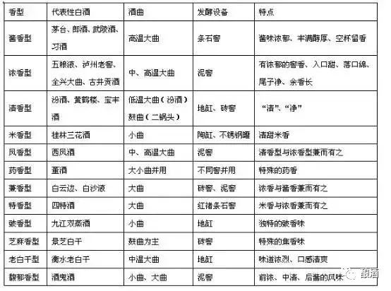 这些香型,分别有专属自己的代表品牌,他们在酿造原料、酿造设备、以及口感特点上各有不同(见下图表格)