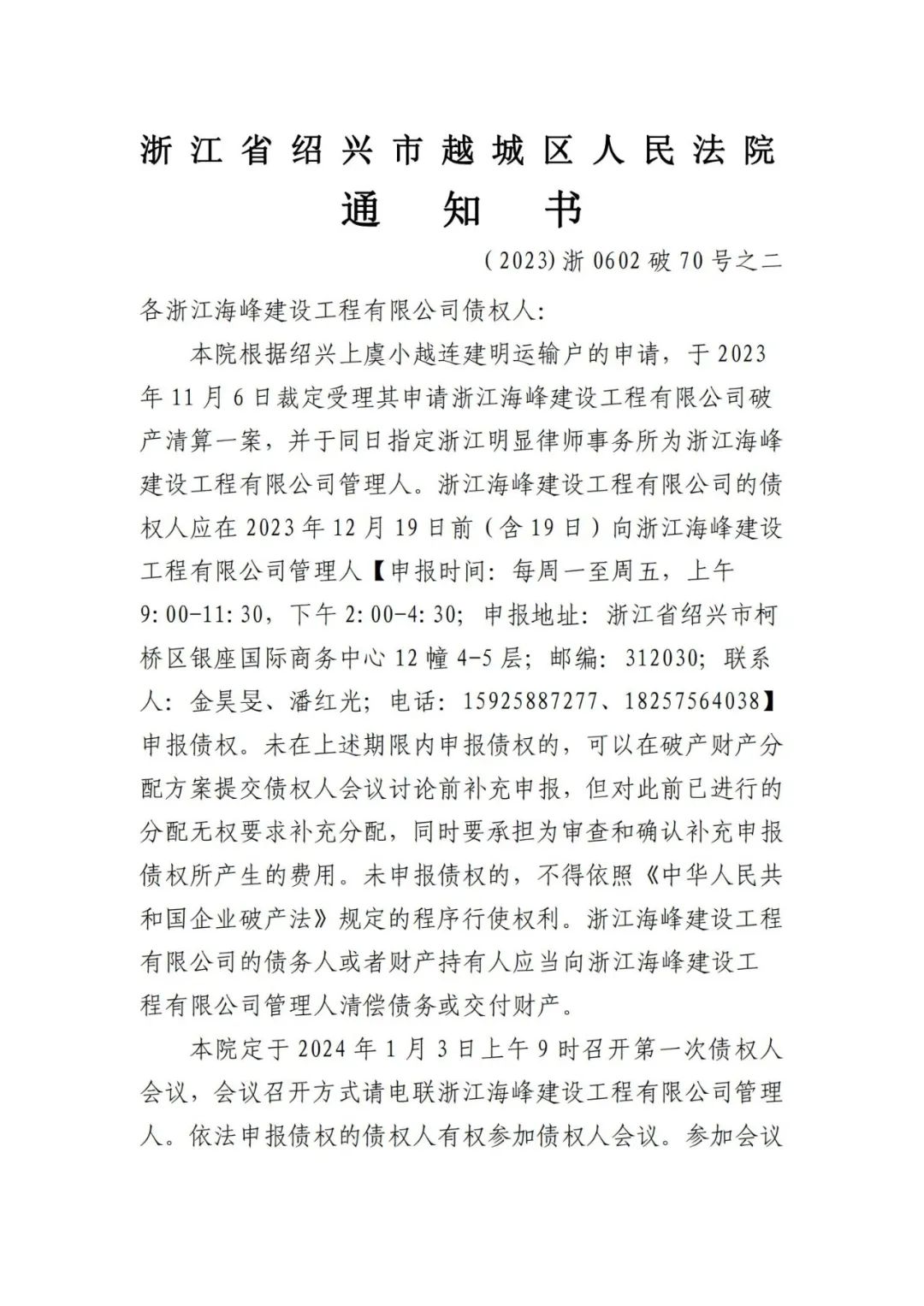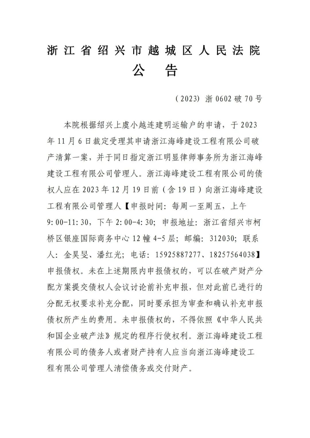 本院根据绍兴上虞小越连建明运输户的申请,于 2023年 11 月 6 日裁定受理其申请浙江海峰建设工程有限公司破产清算一案,并于同日指定浙江明显律师事务所为浙江海峰建设工程有限公司管理人。浙江海峰建设工程有限公司的债权人应在 2023 年 12 月 19 日前(含 19 日)向浙江海峰建设工程有限公司管理人【申报时间:每周一至周五,上午9:00-11:30,下午 2:00-4:30;申报地址:浙江省绍兴市柯桥区银座国际商务中心 12 幢 4-5 层;邮编:312030;联系人:金昊旻、潘红光;电话:15925887277、18257564038】申报债权。未在上述期限内申报债权的,可以在破产财产分配方案提交债权人会议讨论前补充申报,但对此前已进行的分配无权要求补充分配,同时要承担为审查和确认补充申报债权所产生的费用。未申报债权的,不得依照《中华人民共和国企业破产法》规定的程序行使权利。浙江海峰建设工程有限公司的债务人或者财产持有人应当向浙江海峰建设工程有限公司管理人清偿债务或交付财产。