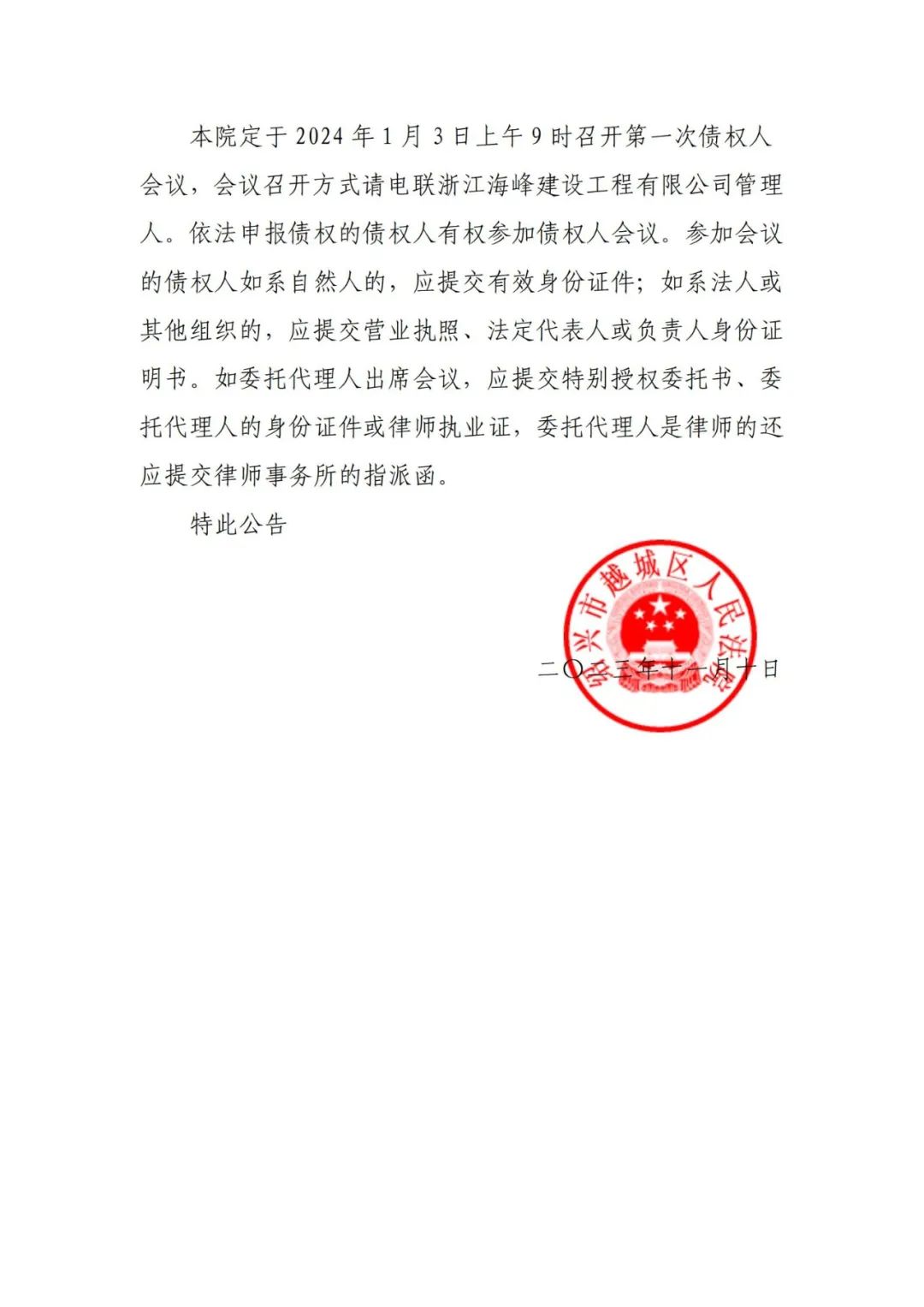 本院定于 2024 年 1 月 3 日上午 9 时召开第一次债权人会议,会议召开方式请电联浙江海峰建设工程有限公司管理人。依法申报债权的债权人有权参加债权人会议。参加会议的债权人如系自然人的,应提交有效身份证件;如系法人或其他组织的,应提交营业执照、法定代表人或负责人身份证明书。如委托代理人出席会议,应提交特别授权委托书、委托代理人的身份证件或律师执业证,委托代理人是律师的还应提交律师事务所的指派函。