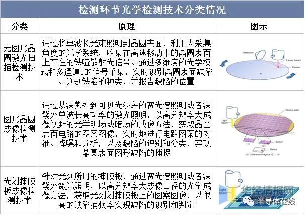在检测环节,光学检测技术可进一步分为无图形晶圆激光扫描检测技术、图形晶圆成像检测技术和光刻掩膜板成像检测技术。