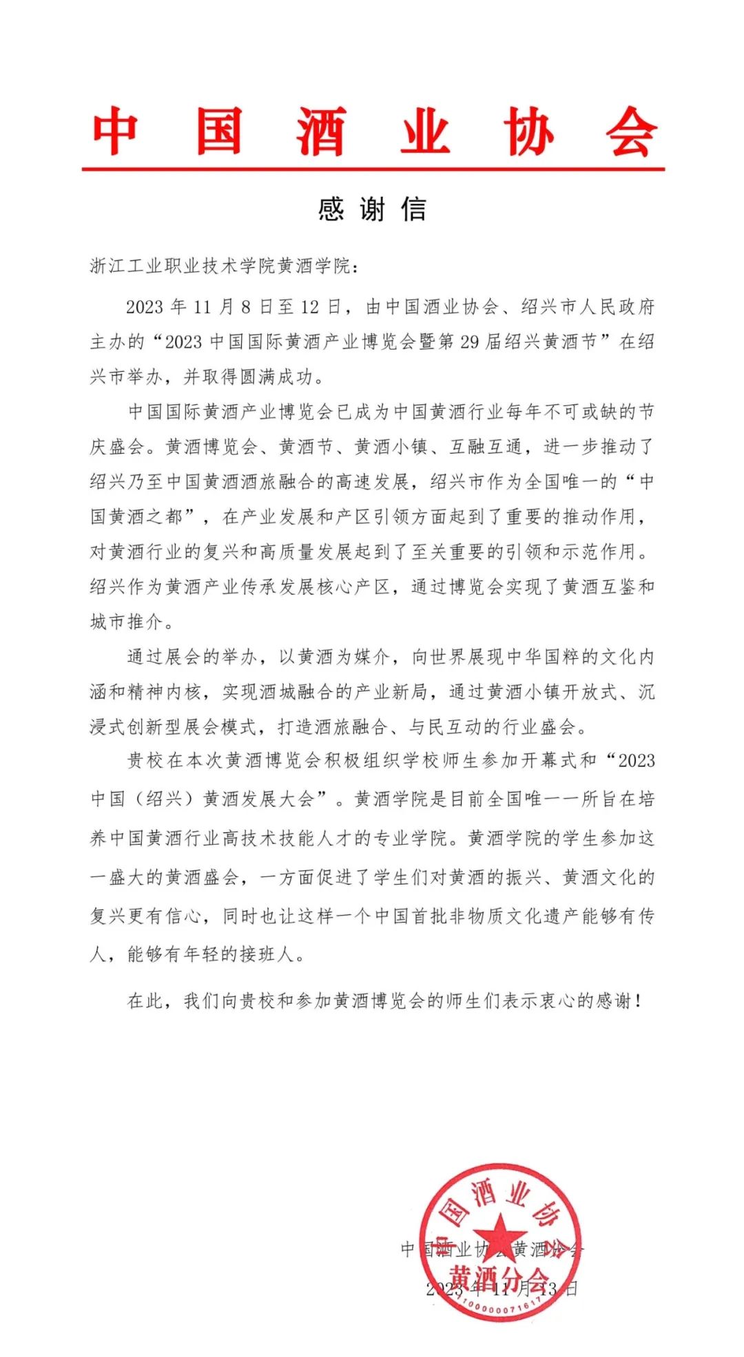 一封来自中国酒业协会的感谢信