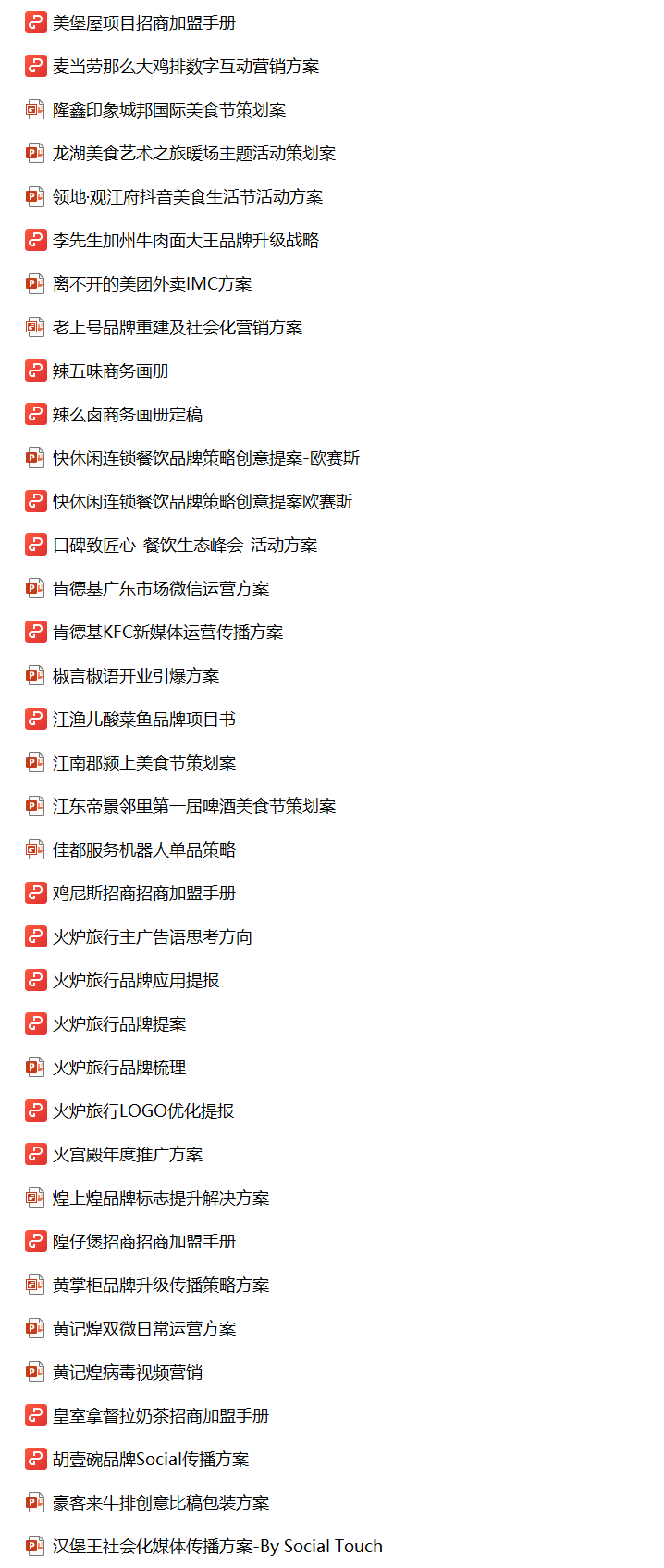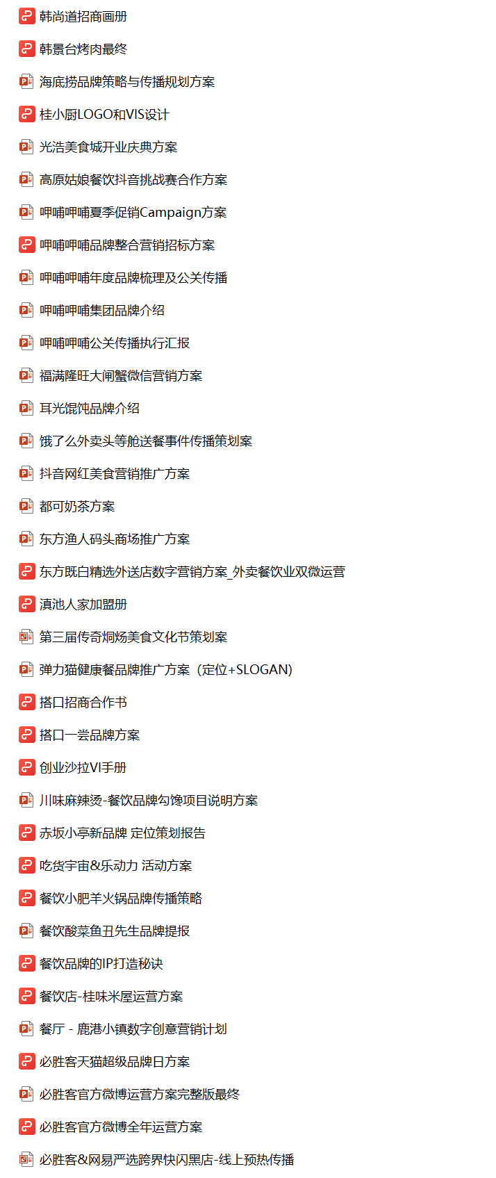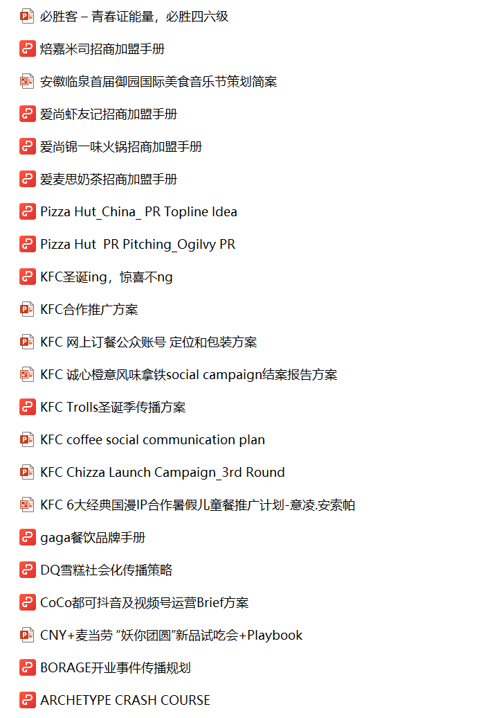包括:某个知名品牌从创立之初到现在的几乎所有广告营销案例。其中包括某个品牌的背景、品牌分析、品牌包装设计、品牌VI、广告策略分析、品牌发展脉络、历年精选案例的说明等。